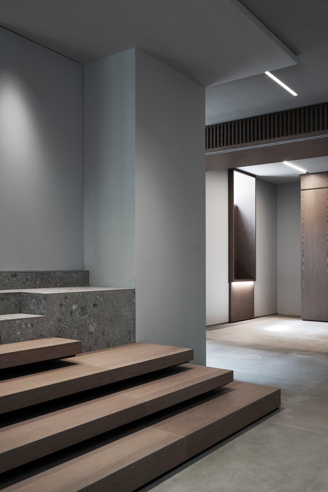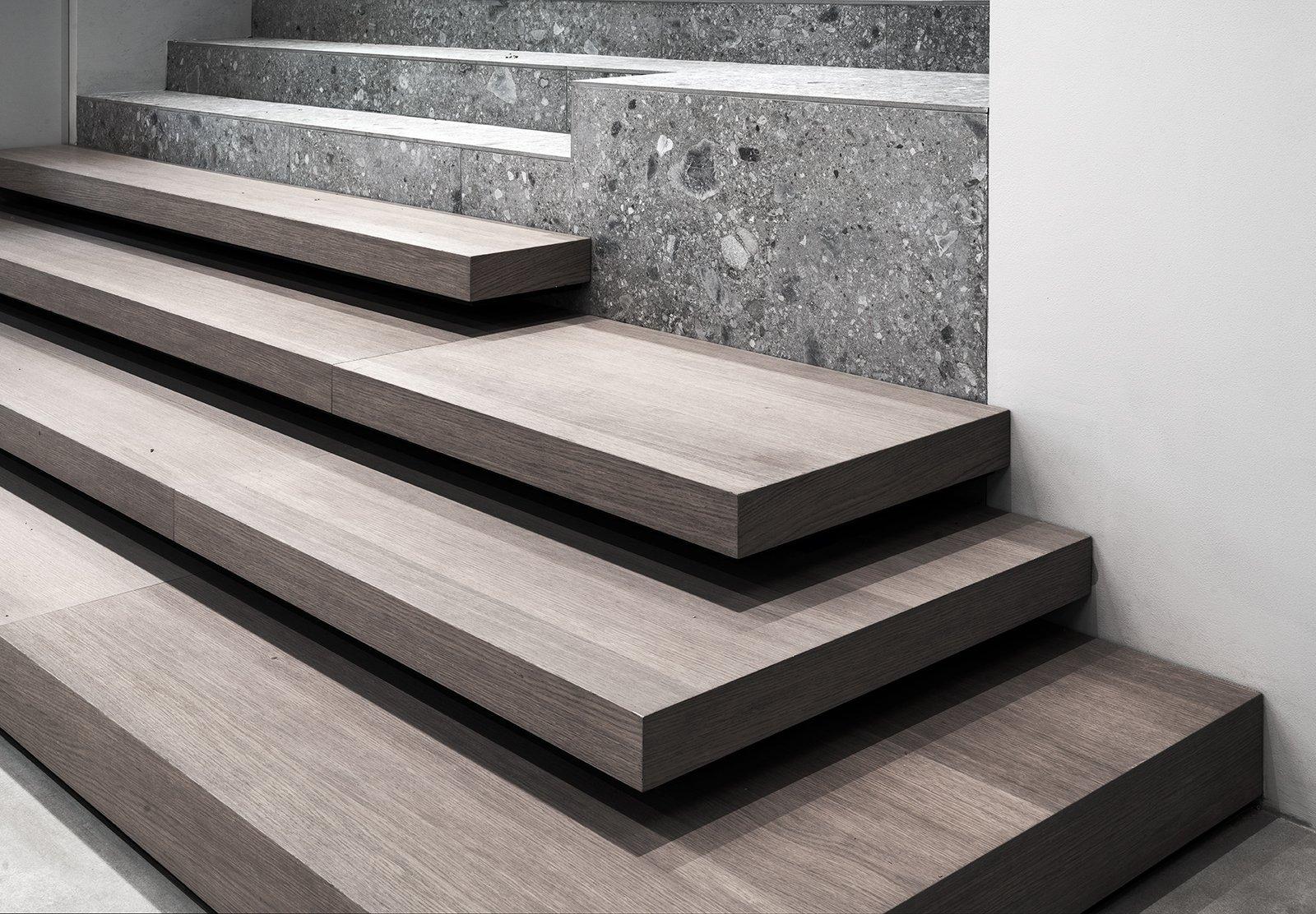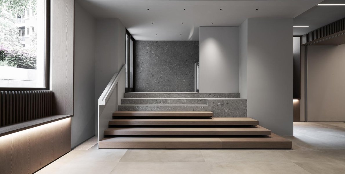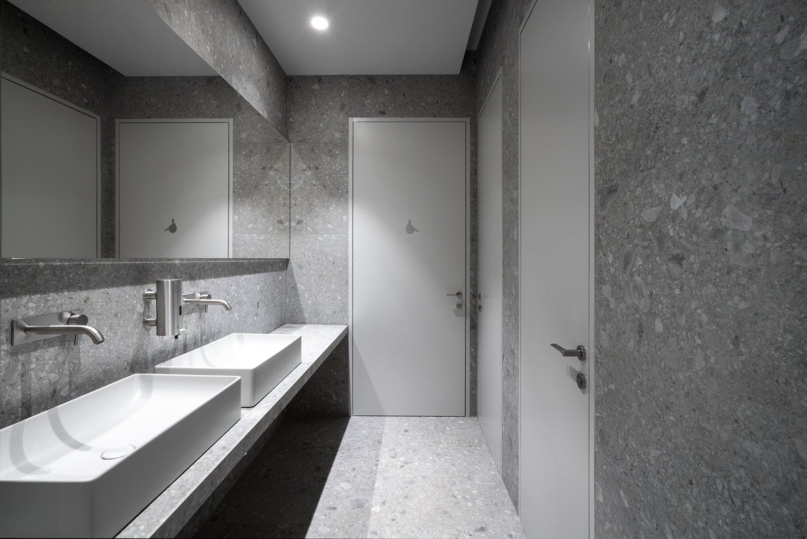 W celu podkreślenia ciągłości z naturalnymi kamieniami występującymi poza budynkami wybrano gres porcelanowy marki Marazzi, a konkretnie kolekcję Mystone Ceppo di Gré, z naturalnym wykończeniem i w dużym formacie (75×150 cm). Płyty te położono na wejściu do przestrzeni wielofunkcyjnej, w części klatki schodowej i we wszystkich łazienkach, również na ścianach. Naturalną serię Powder Mud (75×150 cm) zastosowano natomiast na podłodze w przestrzeni wielofunkcyjnej i w dépendance. Zastosowany w tej kolekcji efekt cementu ma bowiem nawiązywać do innych, istniejących już tam, podłóg: dezaktywowanego betonu z naturalnymi kamieniami i lastryka. „Wybrałam gres Marazzi ze względu na jego jakość estetyczną, która ma niezwykle istotne znaczenie w tak prestiżowym miejscu. Ale ważna jest też jego praktyczność, która przekłada się na łatwiejsze codzienne utrzymanie go i higienę, niezbędne zwłaszcza w miejscu przeznaczonym na organizację różnych wydarzeń. Równie istotna jest też trwałość tego materiału w miarę upływu czasu”.