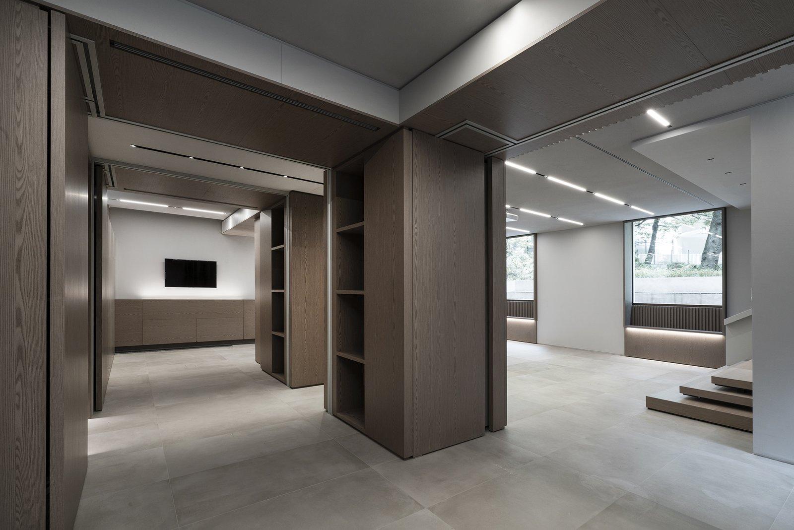 Sporą uwagę poświęcono stałym elementom wyposażenia obecnym w poszczególnych pomieszczeniach. Na przykład w galerii zaprojektowano prawdziwą aranżację naprzemiennych siedzisk z okrągłymi tarczami, dzięki którym subtelnie ukryto instalacje. Podobnie w przestrzeni wielofunkcyjnej boazeria obwodowa zmienia się w stanowiska robocze, a przesuwne ścianki działowe są schowane w dużych szafkach stających w środkowej części. Ponadto w ogrodzie wykonano, zgodnie z projektem, dużą półkolistą ławę z kamienia oraz ławki drewniane pod pergolą.