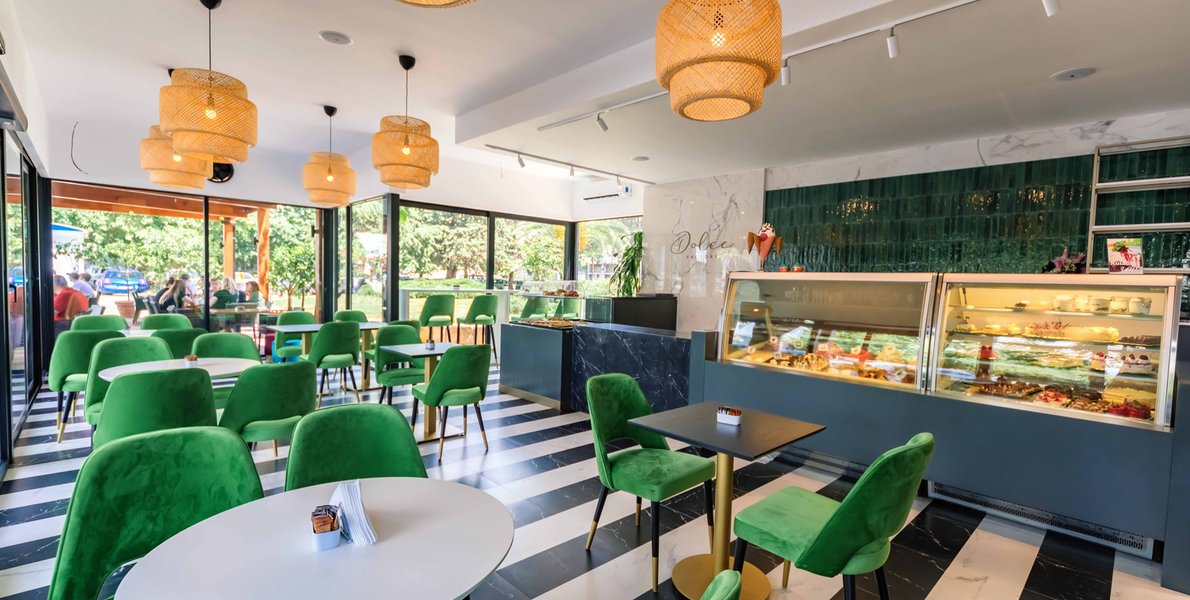 W tym projekcie otwartej niedawno przy typowej nadmorskiej promenadzie w miejscowości Bar, w Czarnogórze, cukierni konieczne było stworzenie środowiska, które mogłoby przyciągnąć różnego rodzaju klientów, zarówno lokalnych, jak i zagranicznych. Wybrana paleta kolorów jest wyrazista i modna, a wśród materiałów znajdziemy zarówno ceramikę, jak i kamień, ale też aksamit i tapetę. Kluczowe bowiem znaczenie miały okładziny ścienne i podłogowe: wszystkie razem zdołały stworzyć kolorowy i przytulny lokal.