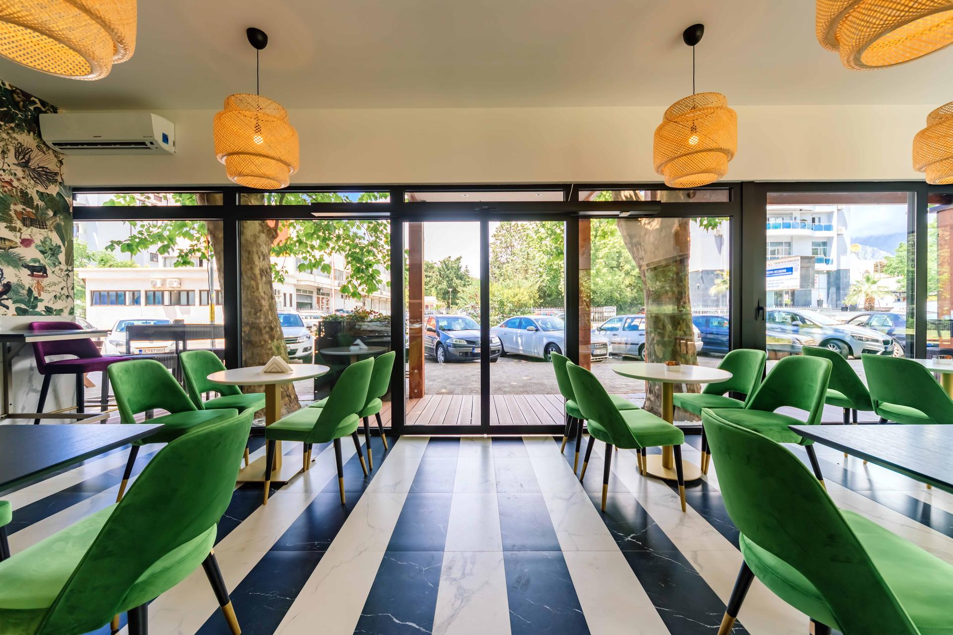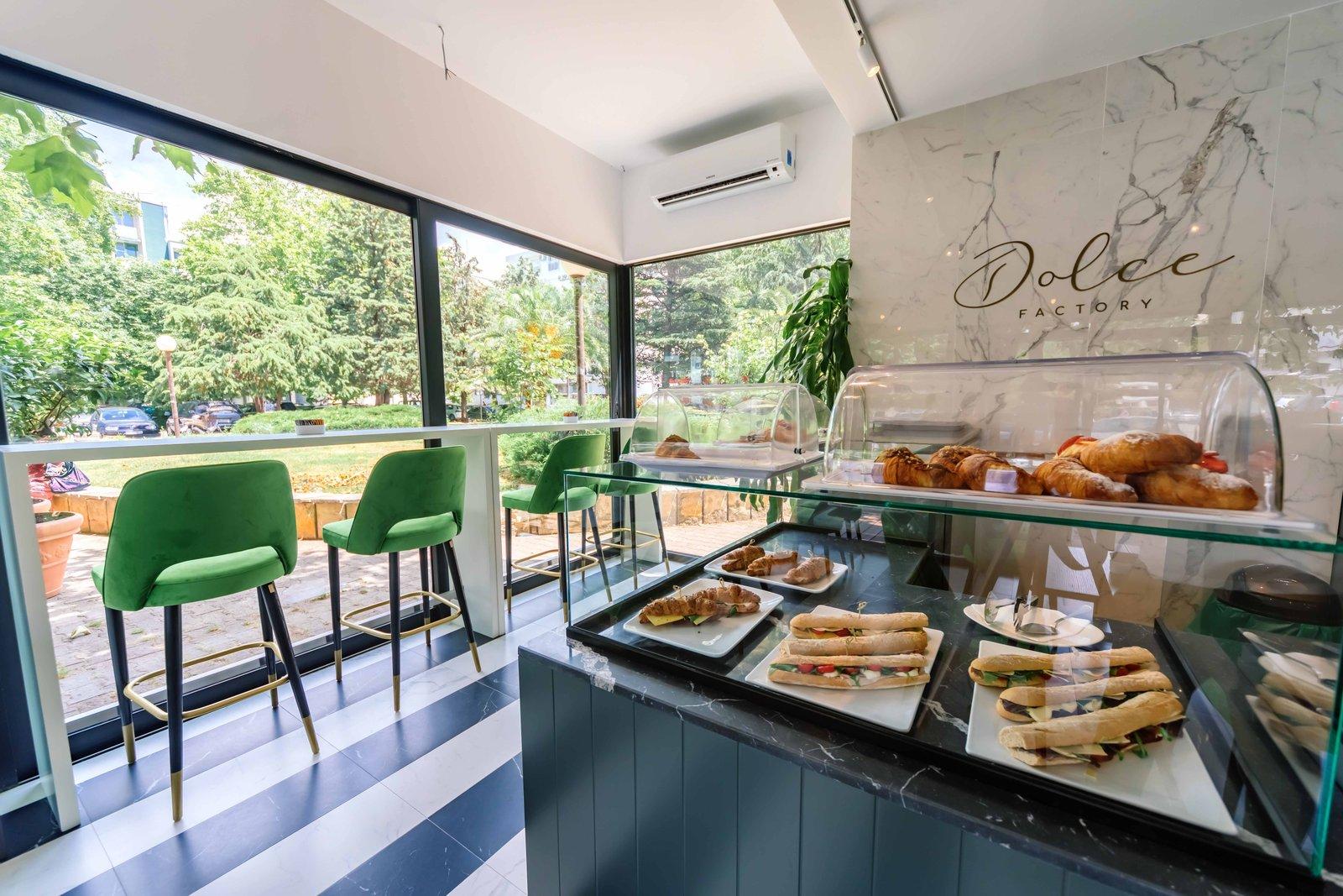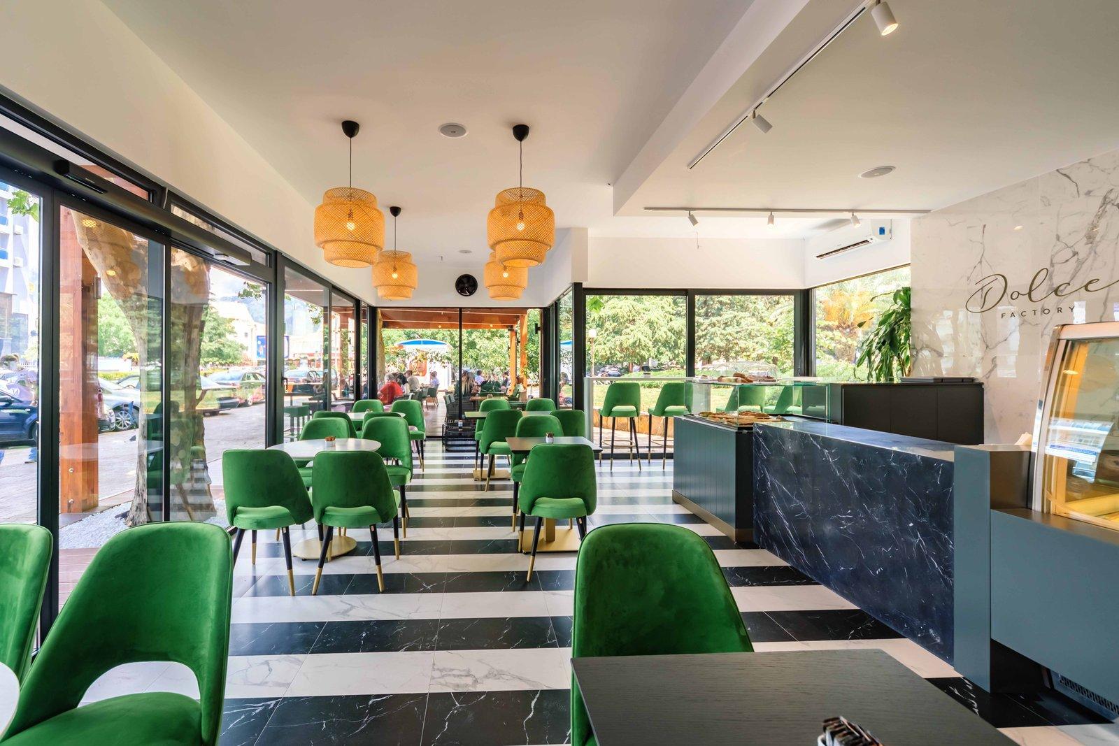 W tym projekcie otwartej niedawno przy typowej nadmorskiej promenadzie w miejscowości Bar, w Czarnogórze, cukierni konieczne było stworzenie środowiska, które mogłoby przyciągnąć różnego rodzaju klientów, zarówno lokalnych, jak i zagranicznych. Wybrana paleta kolorów jest wyrazista i modna, a wśród materiałów znajdziemy zarówno ceramikę, jak i kamień, ale też aksamit i tapetę. Kluczowe bowiem znaczenie miały okładziny ścienne i podłogowe: wszystkie razem zdołały stworzyć kolorowy i przytulny lokal.
