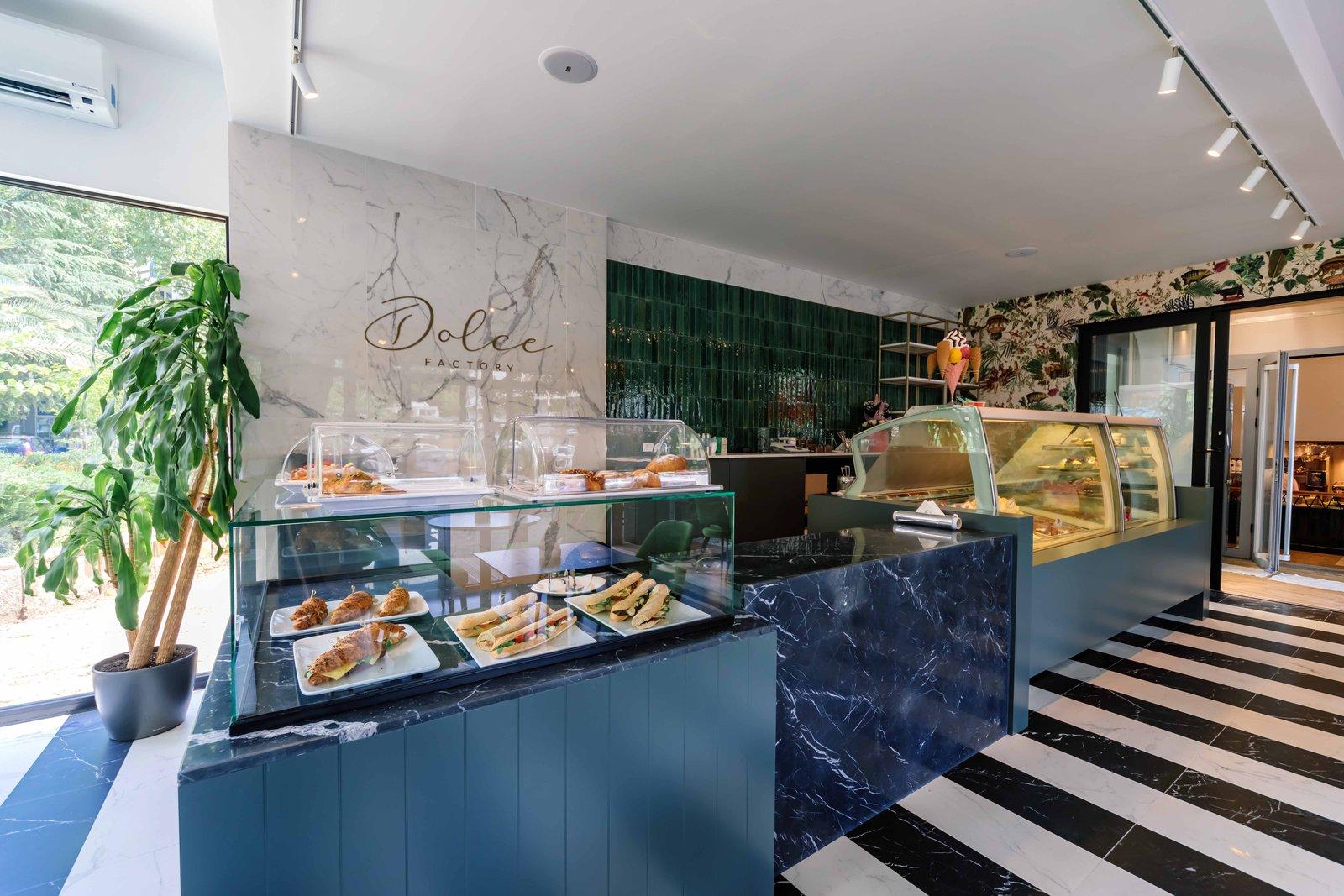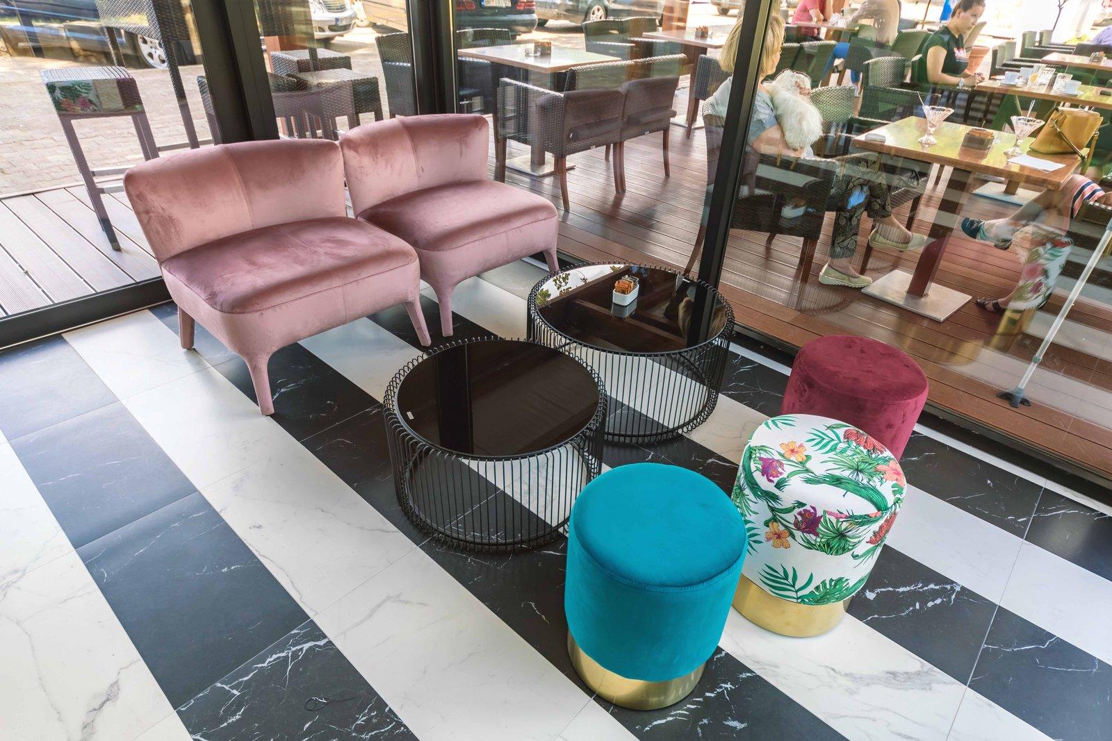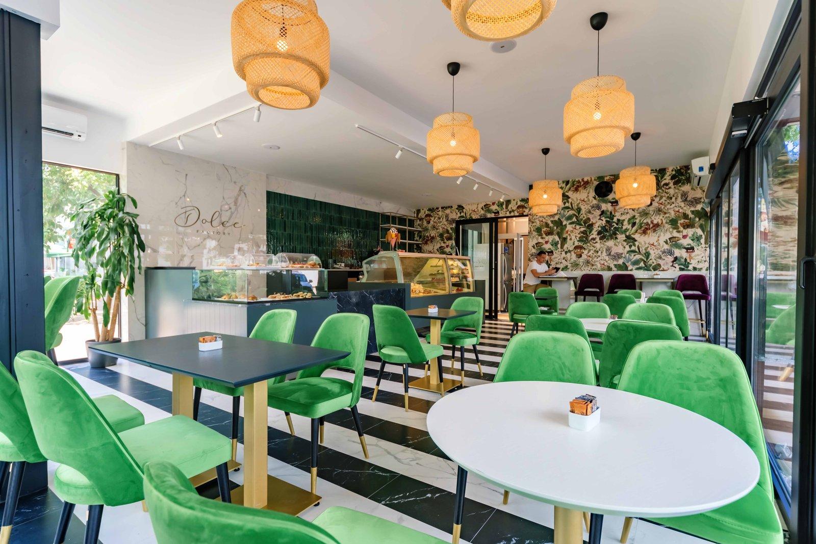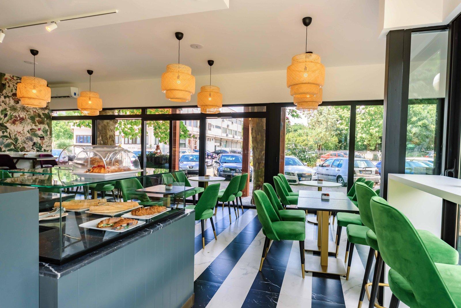 W tym projekcie otwartej niedawno przy typowej nadmorskiej promenadzie w miejscowości Bar, w Czarnogórze, cukierni konieczne było stworzenie środowiska, które mogłoby przyciągnąć różnego rodzaju klientów, zarówno lokalnych, jak i zagranicznych. Wybrana paleta kolorów jest wyrazista i modna, a wśród materiałów znajdziemy zarówno ceramikę, jak i kamień, ale też aksamit i tapetę. Kluczowe bowiem znaczenie miały okładziny ścienne i podłogowe: wszystkie razem zdołały stworzyć kolorowy i przytulny lokal.