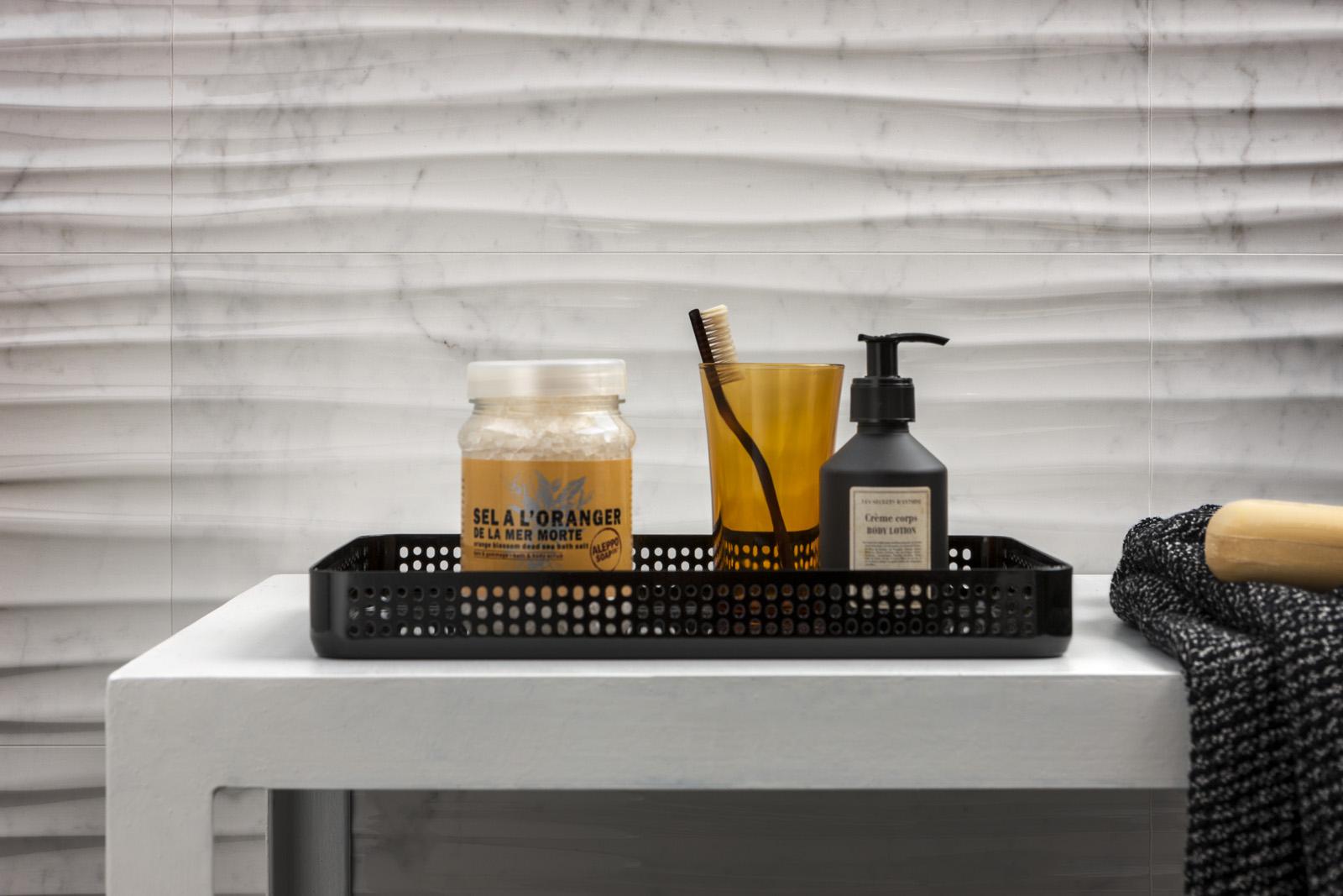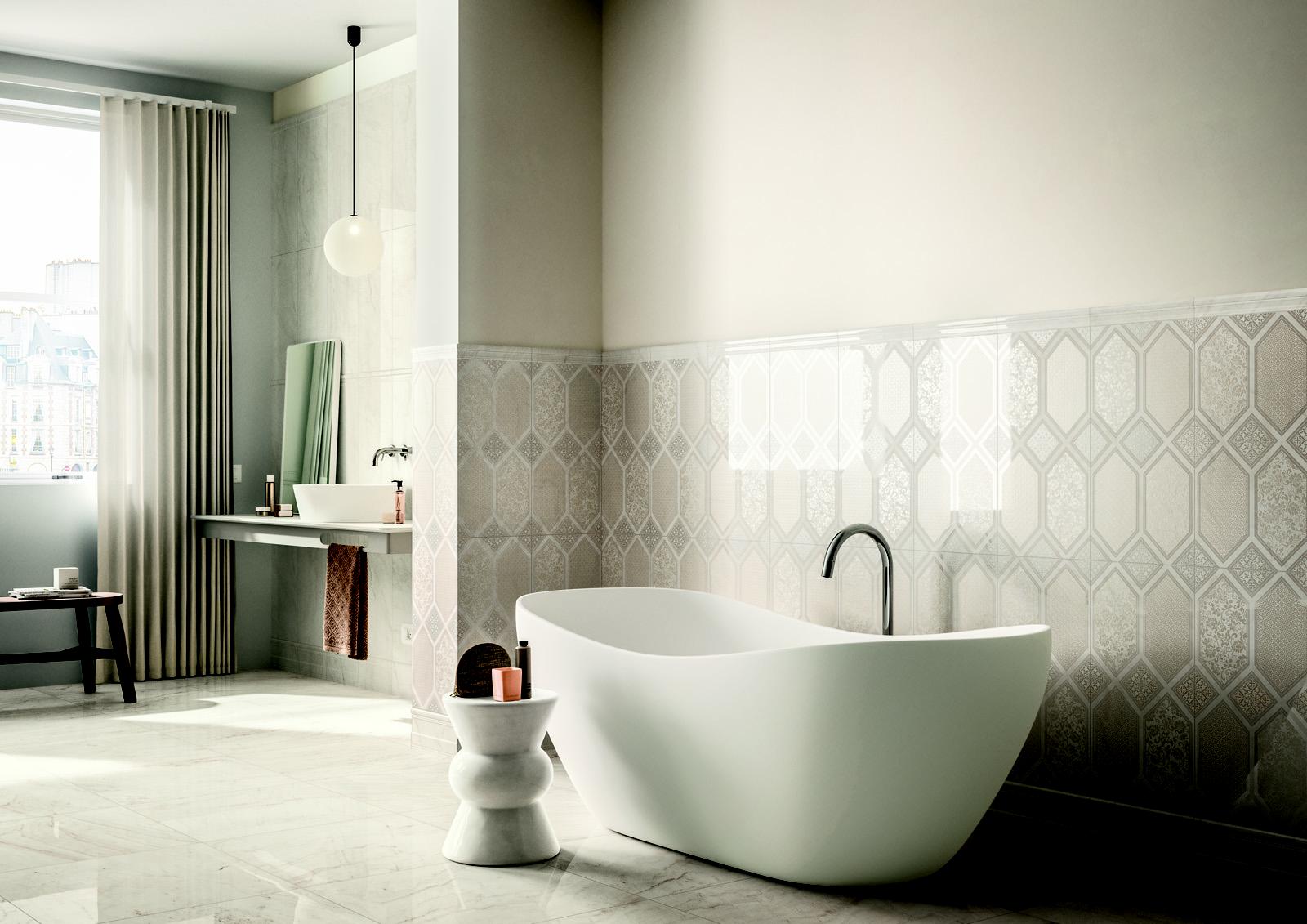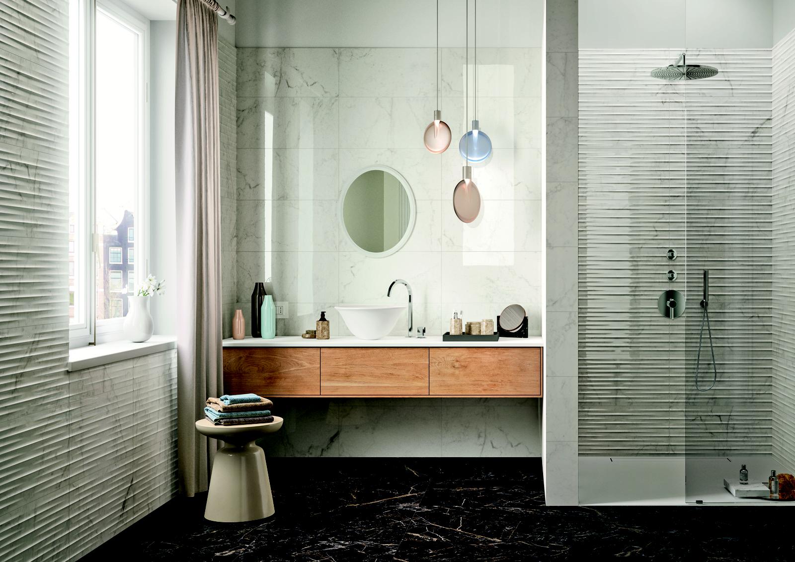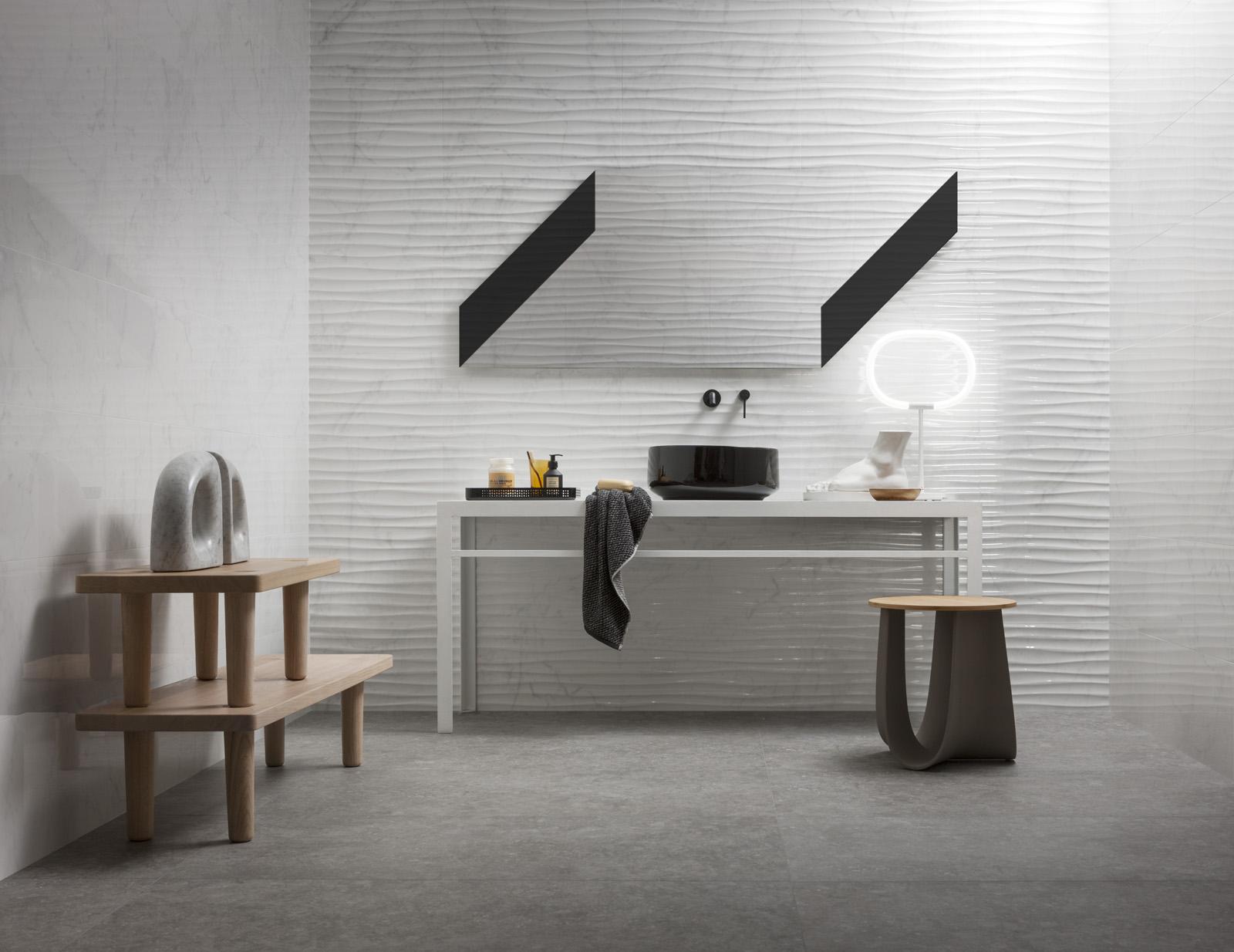 Bohaterem 2 łazienek, jednej prywatnej z dostępem z głównej sypialni, a drugiej przeznaczonej dla gości i pozostałych 2 sypialni, jest również gres o efekcie kamienia: w tym pierwszym przypadku wybrano kolekcję Pietra di Vals, w drugim natomiast Gris Fleury, obie z gamy Mystone. Te dwie kolekcje, ułożone poprzez naprzemienne stosowanie w obu pomieszczeniach formatów 30 x 60 i 60 x 60 w tym samym kolorze (szarym), nadają projektowi jednolity styl: loft ten staje się dzięki temu spójnym i minimalistycznym pomieszczeniem, a dwie łazienki zyskują elegancki i płynny charakter.