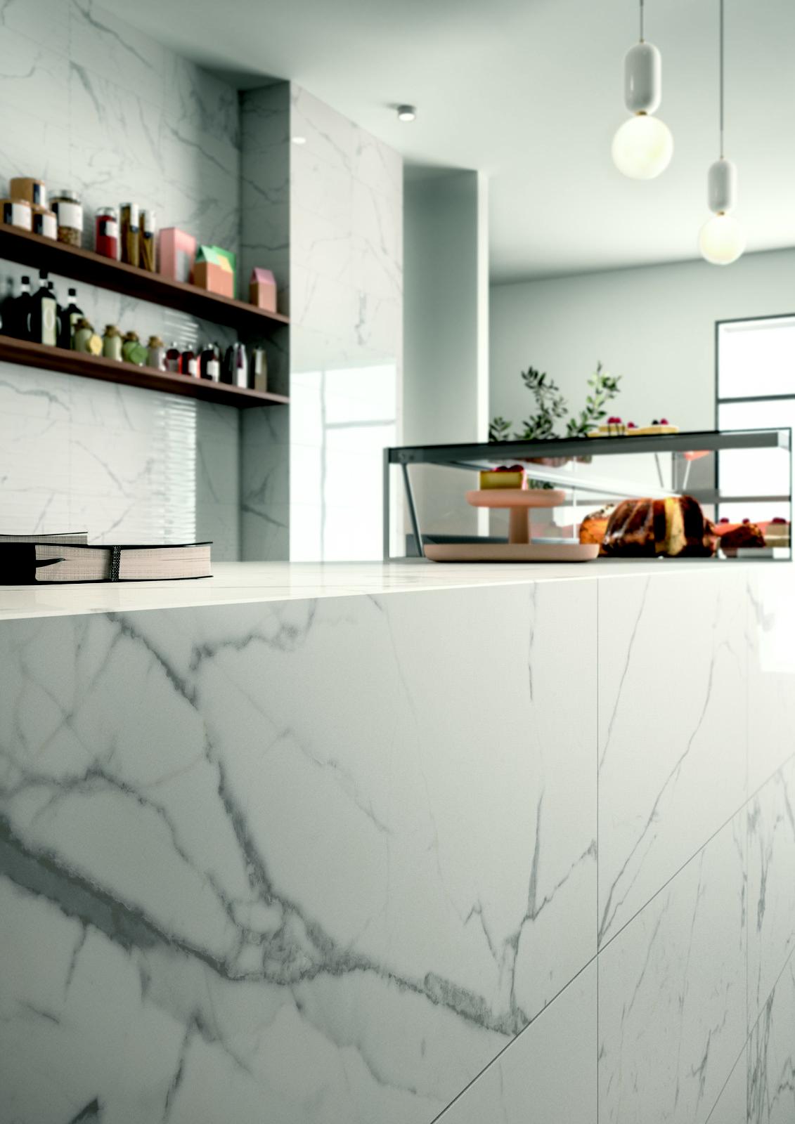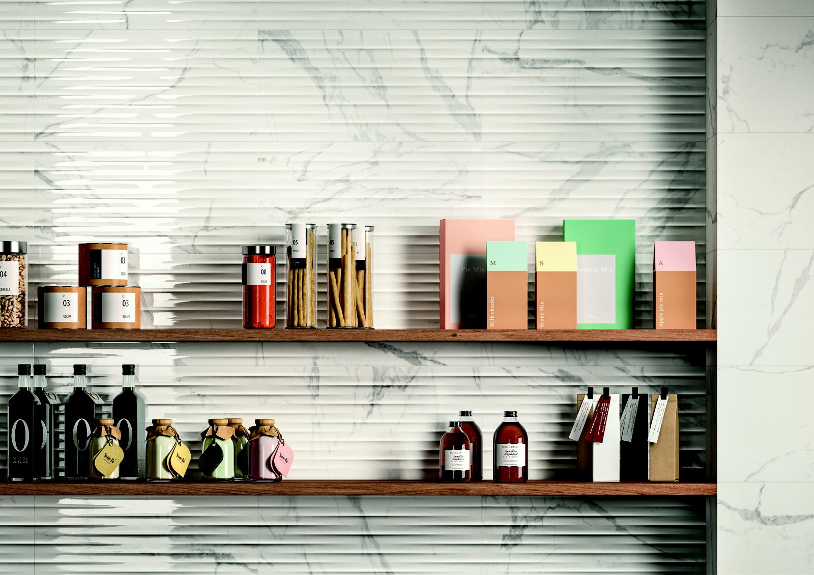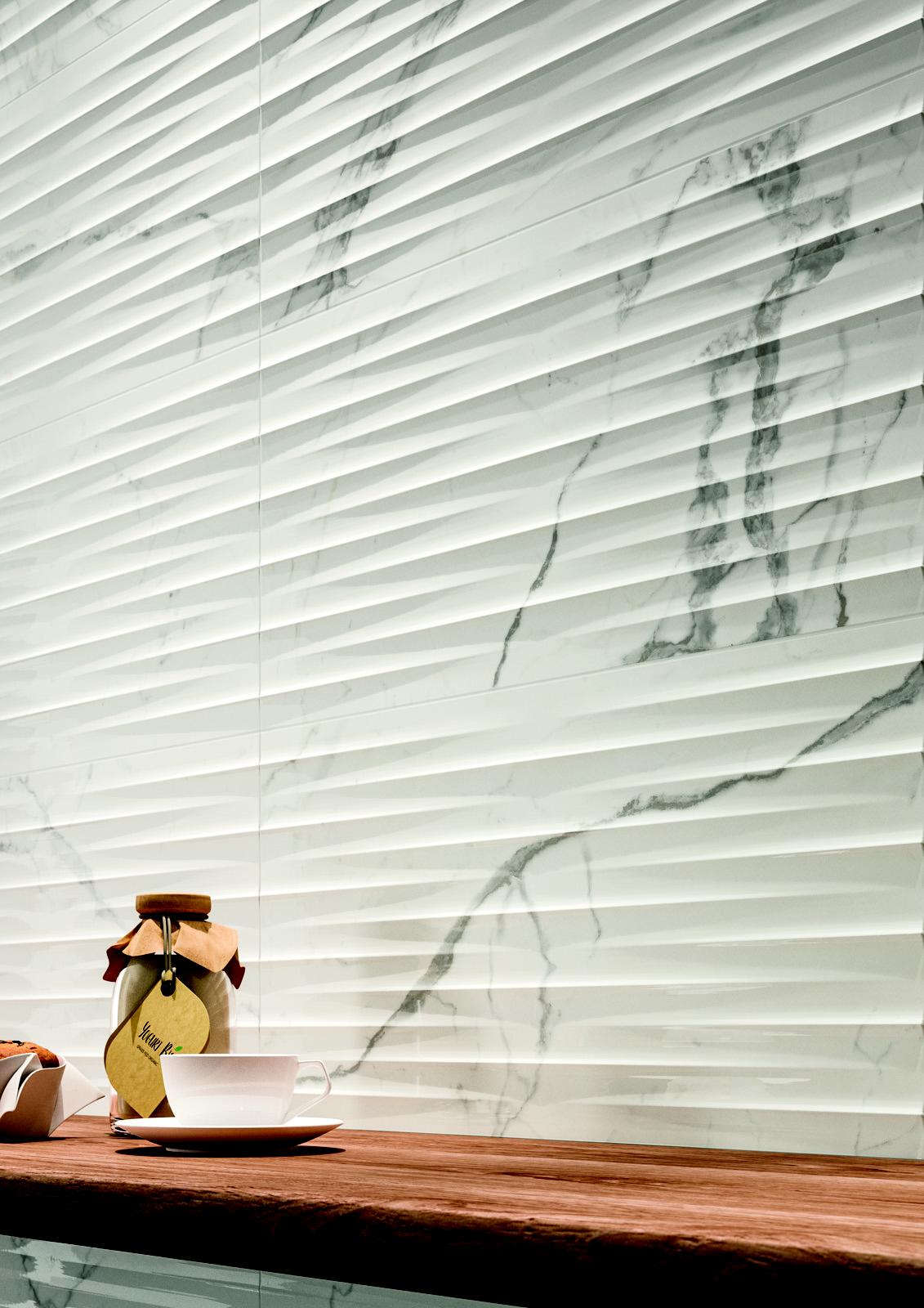 Strefa dzienna typu open space, na parterze, została pokryta kolekcją Mystone Ardesia w dużym formacie 75 x 150: wielkie płyty położono zarówno na podłodze, jak i na ścianie znajdującej się pod dużym łukiem „wychodzącym” na wewnętrzny dziedziniec. Wybrany odcień antracytowy i bogate szczegóły, które nawiązują do żyłkowania typowego dla skał osadowych, czynią to wnętrze eleganckim i ekskluzywnym: ciemny kolor podkreśla w tym przypadku inspirację stylem industrialnym, lecz Mystone Ardesia dostępny jest też w jaśniejszych odcieniach: Cenere i Bianco.