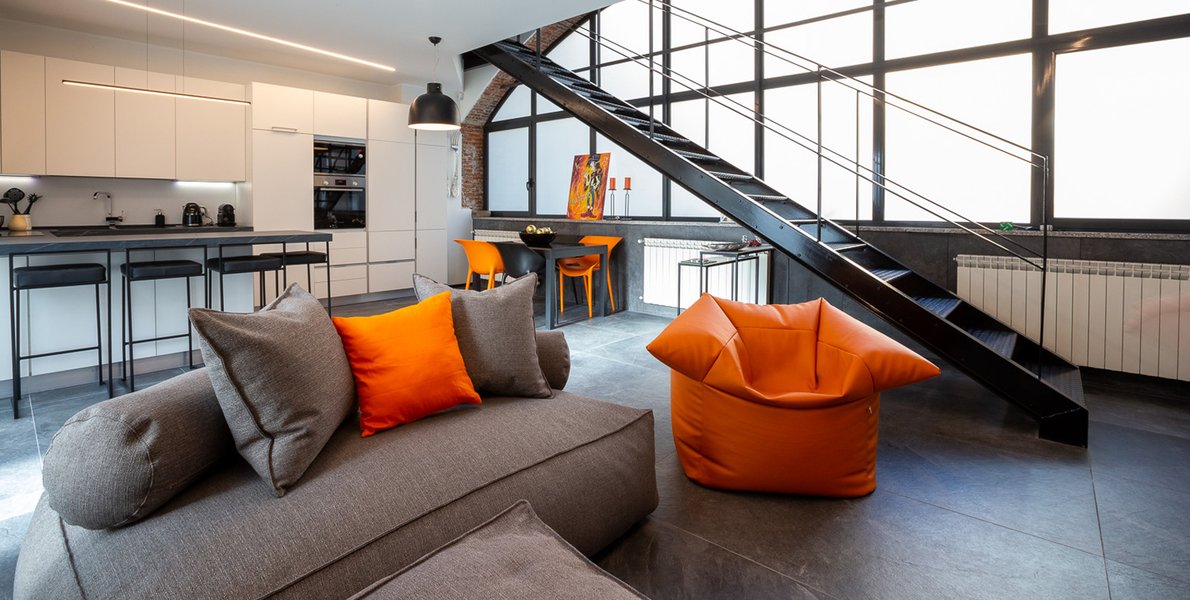 W efekcie powstał nowoczesny loft ewidentnie zainspirowany stylem industrialnym, bazujący na kontrastach między wykończeniami czarnymi metalicznymi, minimalistycznym białym umeblowaniem i kilkoma akcentami w jaskrawych kolorach (głównie żółtym i pomarańczowym). Wybór okładzin padł na gres porcelanowy w przypadku wszystkich wnętrz, ułożony naprzemiennie z gresem o efekcie drewna i efekcie kamienia.