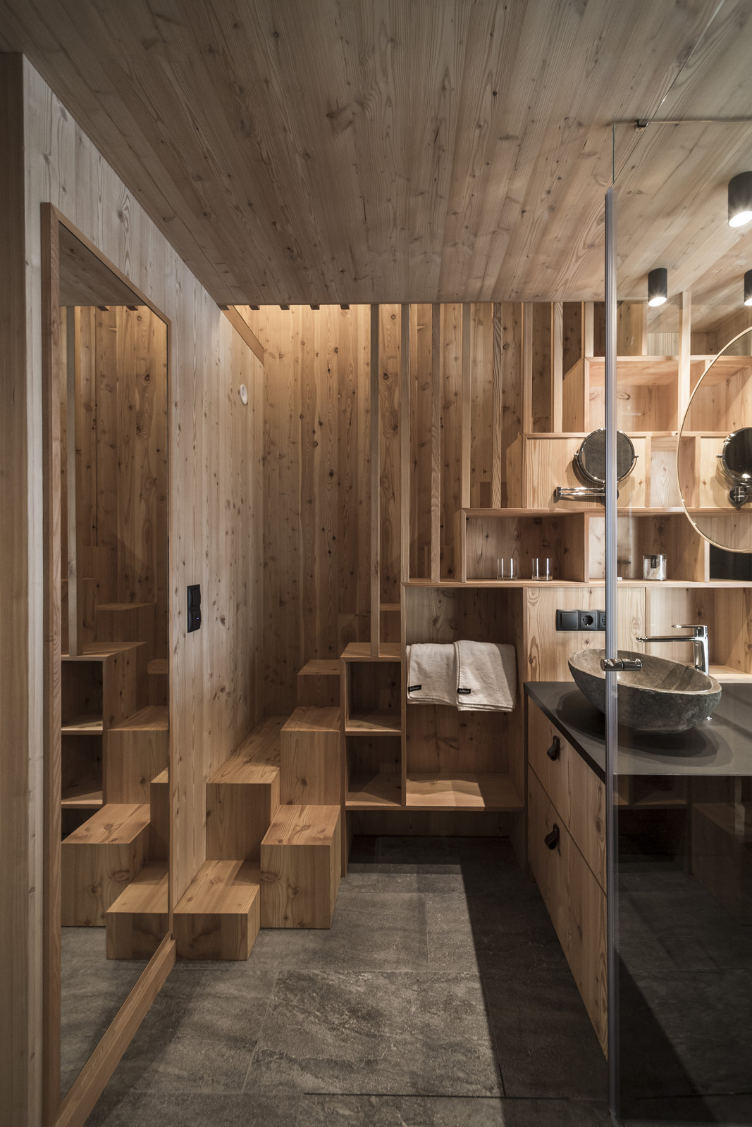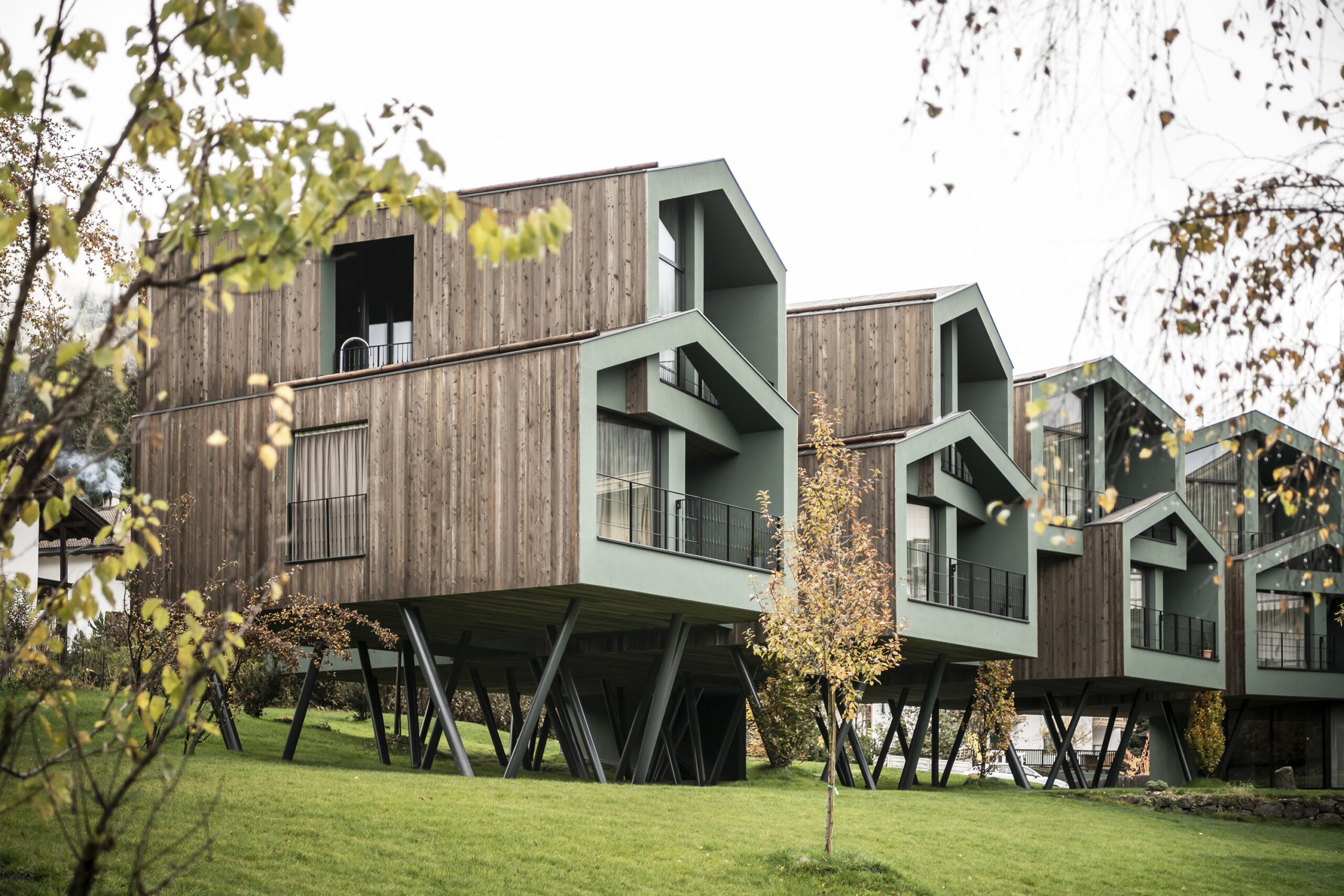 Zrównoważony rozwój to temat przyświecający nam w wielu projektach. Wystarczy kilka przykładów: wykorzystywanie materiałów o niskim wpływie na środowisko, zmniejszanie zużycia gruntów, zachęcanie do zrównoważonej mobilności, korzystanie z usług lokalnych ekip budowlanych, elastyczność przestrzeni, zmniejszanie zanieczyszczenia świetlnego, ponowne wykorzystywanie danej kubatury, wprowadzanie gospodarki o obiegu zamkniętym, ograniczanie promieniowania słonecznego… Przykładowo w alpejskiej wiosce Zallinger, zbudowanej w 2017 roku w Alpe di Siusi (Bolzano, Włochy) na wysokości 2000 m n.p.m., poruszono takie kwestie jak wykluczenie ruchu drogowego czy zmniejszenie powierzchni pokoi, jednocześnie zachowując poziom cenowy mieszczący się w granicach obiektów luksusowych, i całkowicie drewniany system konstrukcyjny. Albo projekt Floris, zrealizowany w 2020 roku w Siusi, wykonany w historycznym parku o wysokich walorach krajobrazowych, w którym — aby zachować jego integralność — nowe apartamenty umieściliśmy na specjalnych słupach, nawiązując do domków na drzewie. Innym przykładem może być ukończony w 2023 roku projekt Apfelhotel Torgglerhof, który stanowi współczesną odsłonę tradycyjnej architektury regionu Trydent-Górna Adyga: od wolumetrycznego układu typowego dla dużego alpejskiego gospodarstwa, w którym każda bryła pełniąca osobną funkcję jest wkomponowana w krajobraz, po wzór krzyża świętego Andrzeja, często spotykanego na południowotyrolskich stodołach, który odtworzono na fasadach apartamentów z widokiem na ogród.