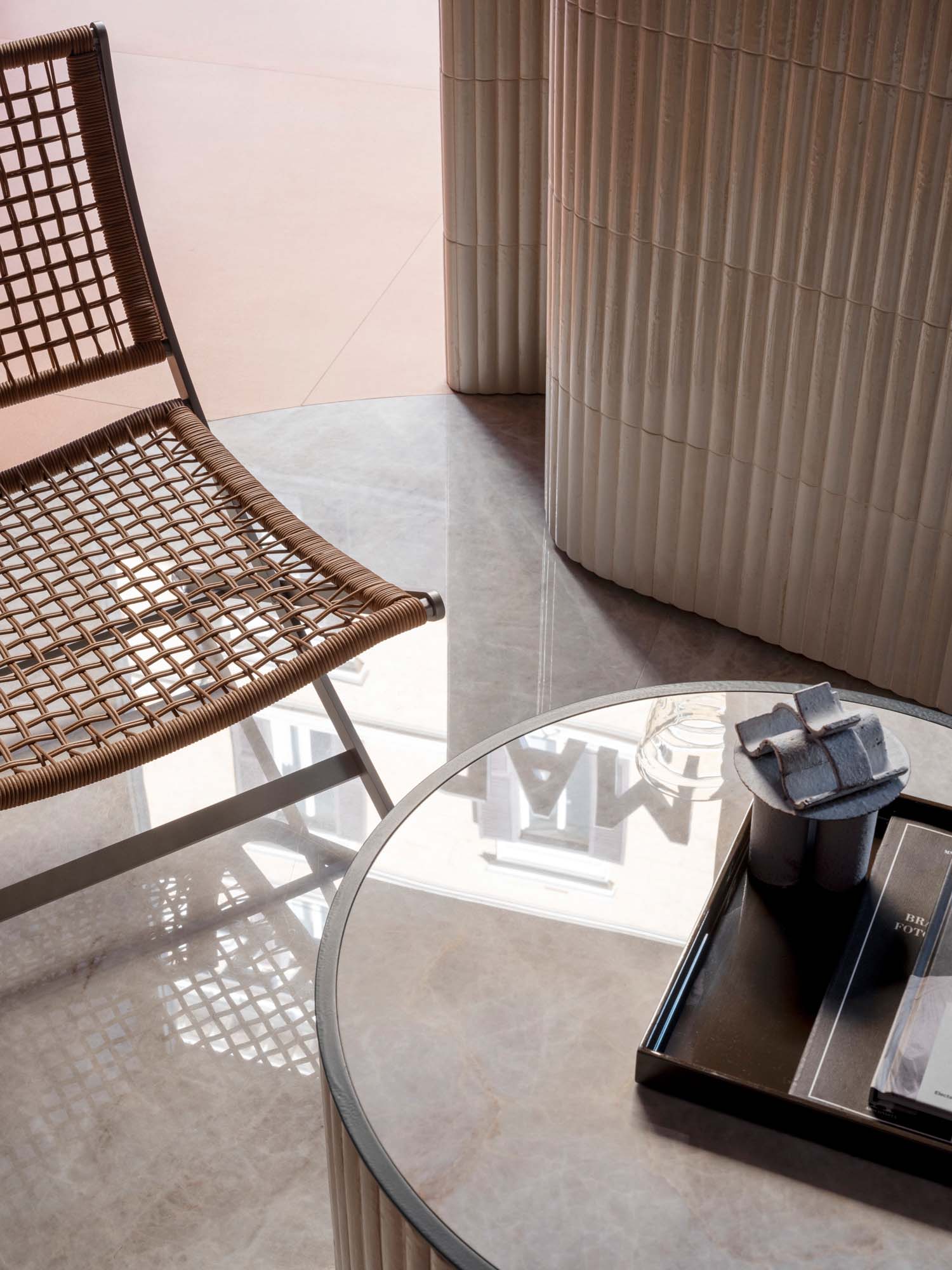 Marazzi Privé, serce projektu, przywołuje ekskluzywną atmosferę hotelowego lobby, łącząc elegancję i funkcjonalność. Trzy autonomiczne, ale połączone środowiska eksplorują wszechstronność produktów Marazzi, reinterpretując dywany, meble i siedzenia z gresu w sekwencji przestrzeni charakteryzujących się prywatnością i komfortem. Wysokie oparcia tworzą intymność, przekształcając każdy kąt w przytulne schronienie. Tutaj użycie ceramiki pokazuje ich zdolność do oferowania innowacyjnych rozwiązań, gdzie zaawansowana technologia, adaptowalność i ponadczasowe piękno nabierają kształtu, obok przedmiotów i rzeźb, które eksplorują odcienie nowych klasyków. Następstwo tematycznych pokoi podkreśla wartość materiałów Marazzi, które, eksponowane w dynamicznych i połączonych przestrzeniach, dialogują z architekturą, tworząc wizualny przepływ, który zaprasza odwiedzających do eksploracji każdego szczegółu.