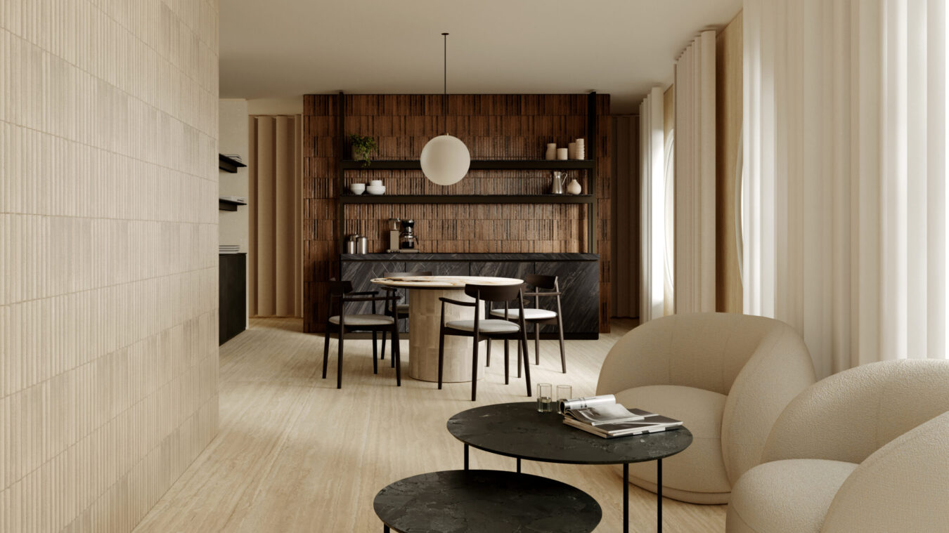 Duże płyty z efektem kamienia w odcieniach Travertino Classico i Berici Beige tworzą tło o neutralnych i dotykowych odcieniach, wzbogacone technologią 3D Ink, która nadaje głębię i charakter powierzchniom. Przestrzenie zostały zaprojektowane tak, aby oferować płynne i wyrafinowane doświadczenie hotelarskie. W strefie dziennej znajdują się meble wykonane z płyt z gresu porcelanowego The Top Stone Look Bahia Black i Marble Look Patagonia, połączone z nowymi odcieniami małego formatu Crogiolo Lume.