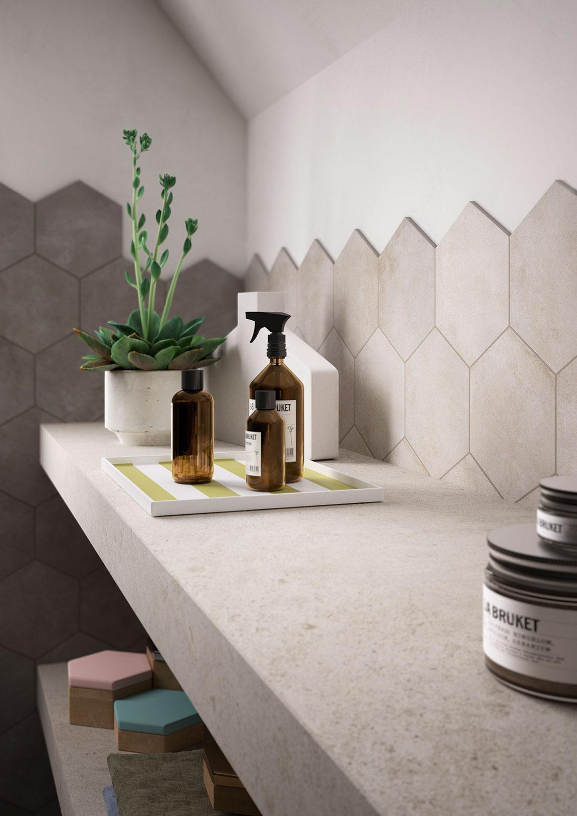 Płytki sześciokątne z kolekcji Clays symbolizują ideę eleganckiego spotkania tego, co dawne, z tym, co współczesne: terakota i cement uzupełniają się wzajemnie, tworząc mocny efekt wizualny.