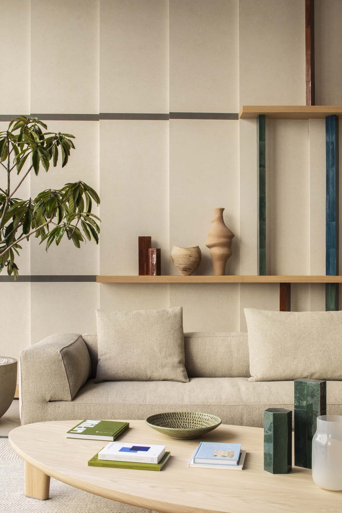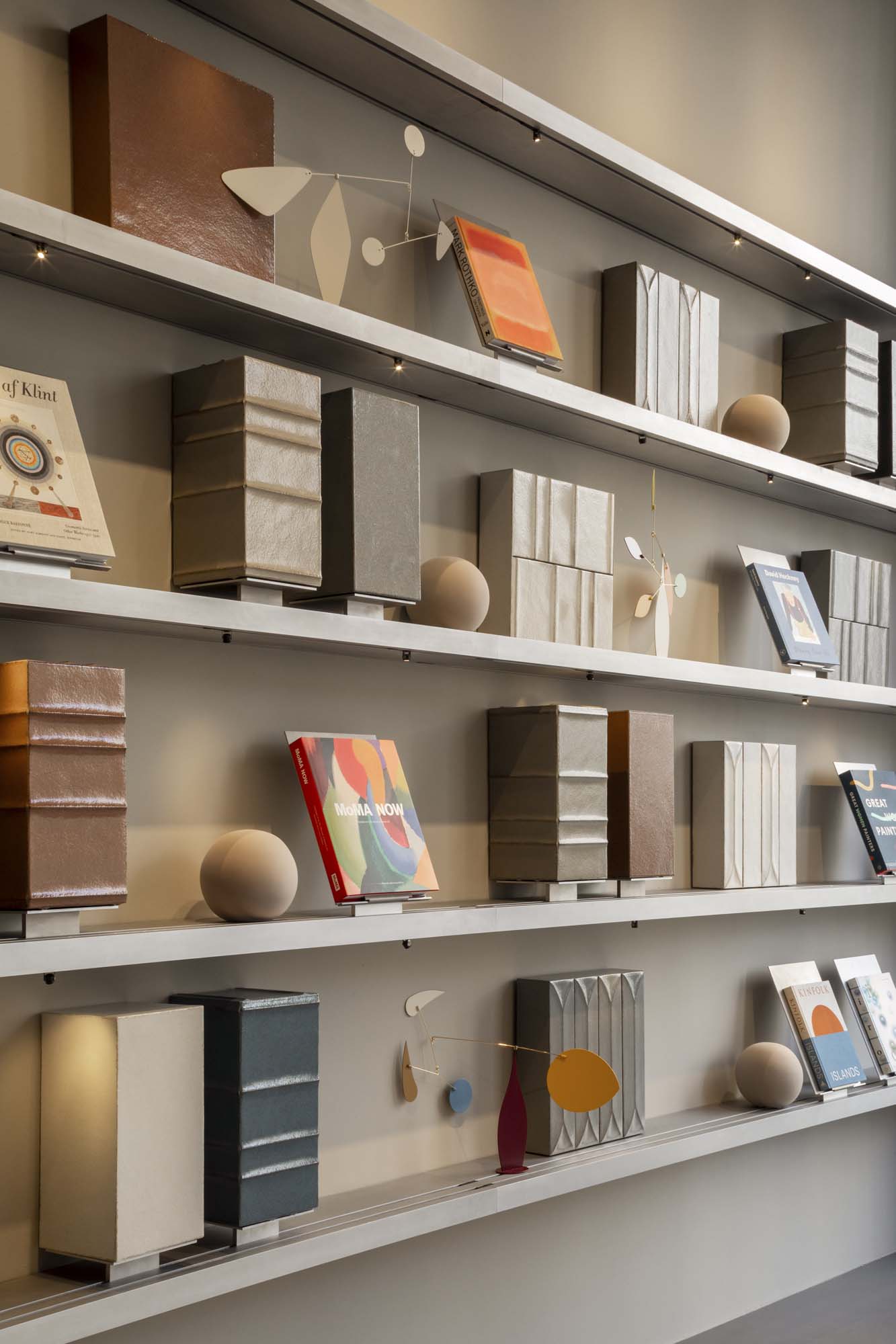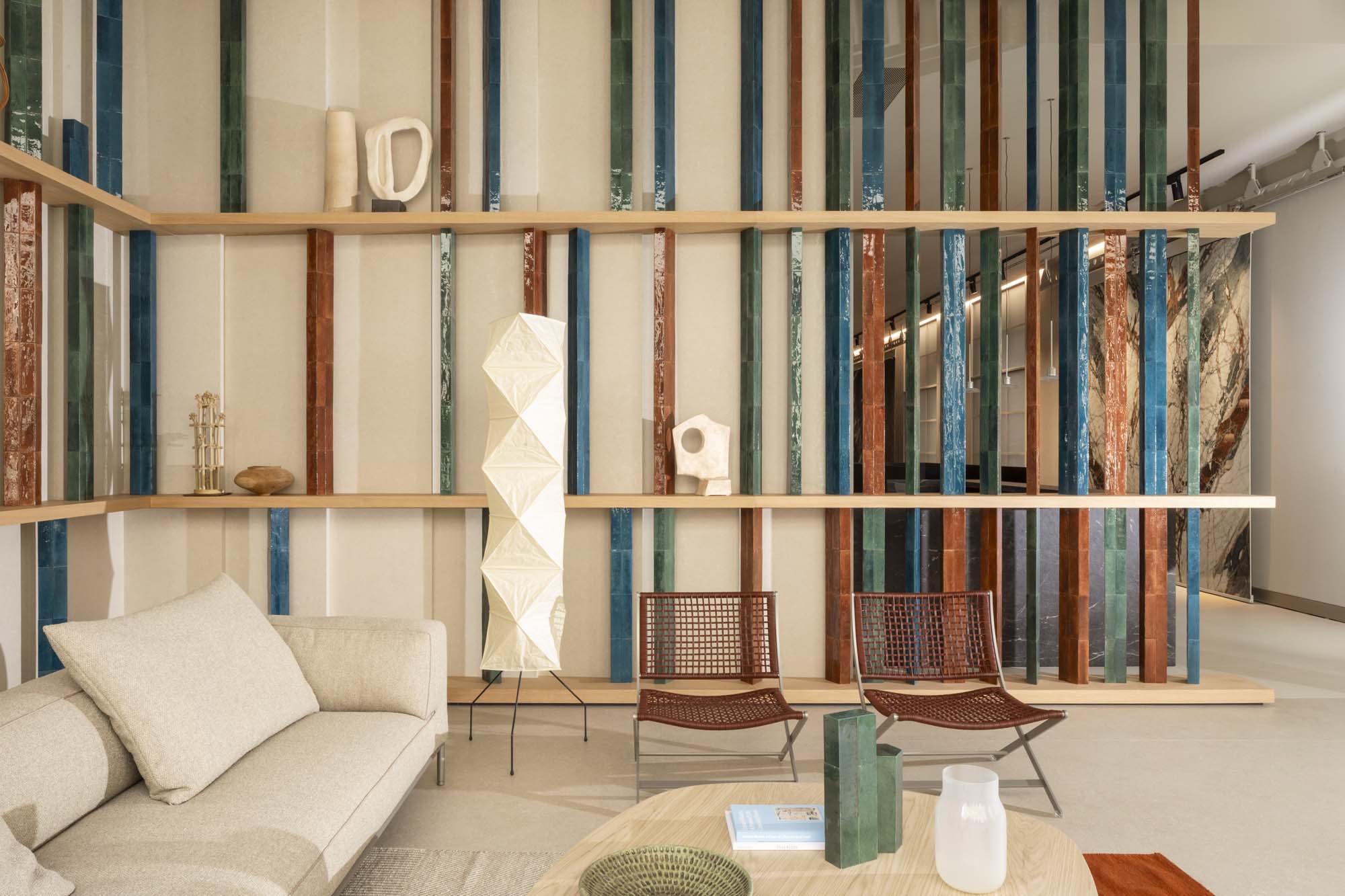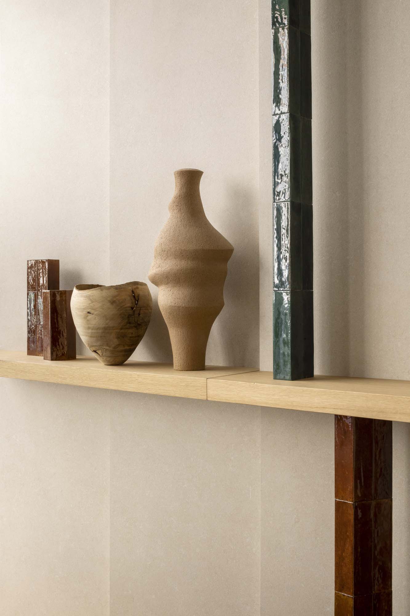 Półki biblioteczne stają się uprzywilejowanym miejscem do eksponowania przedmiotów i dzielenia się emocjami i wspomnieniami. Cięta, fazowana i skomponowana w najróżniejszych wzorach ceramika przekształca się w protagonistów historii, która mówi o rzemiośle i zdolności przekształcania materiału przemysłowego w unikalny produkt, dodając głębi i narracji przestrzeni.