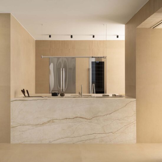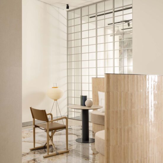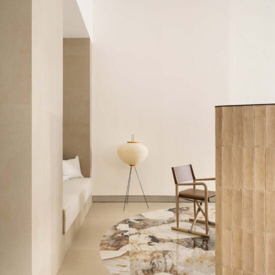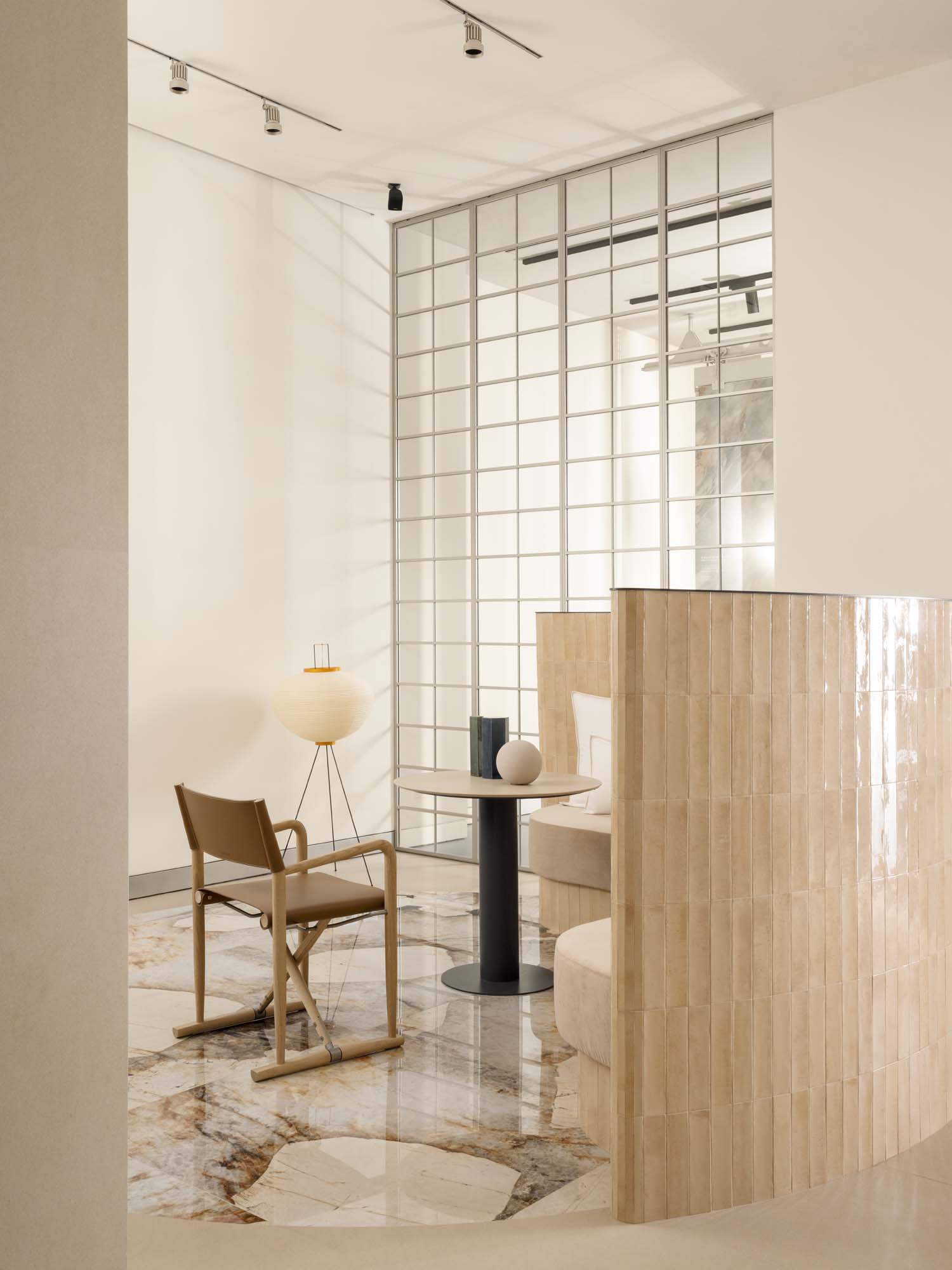 ACPV ARCHITECTS Antonio Citterio Patricia Viel pracował nad definiowaniem ciepłego i otulającego środowiska, w którym niekonwencjonalne użycie porcelanowego gresu wykracza poza prostą okładzinę, stając się autentycznym elementem wyposażenia.