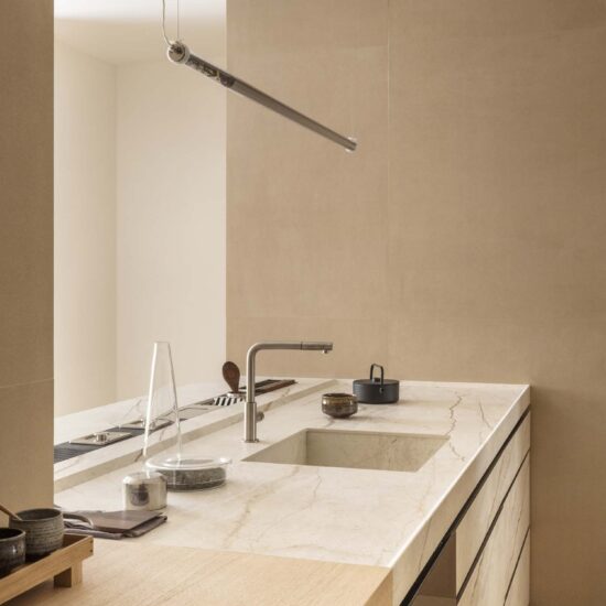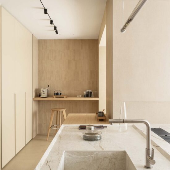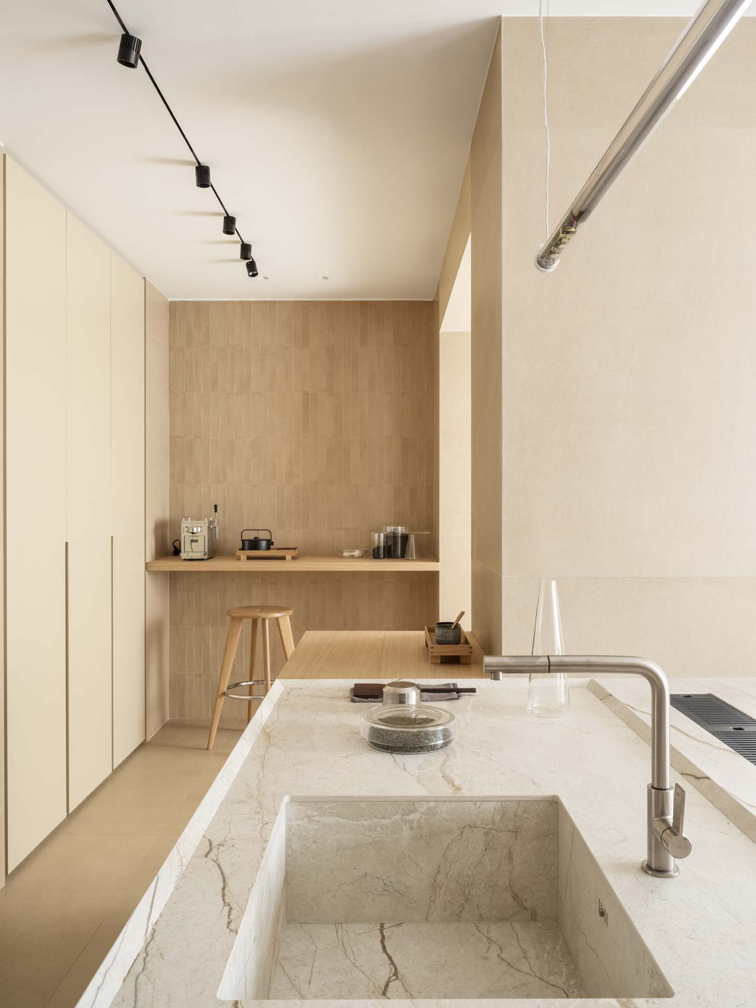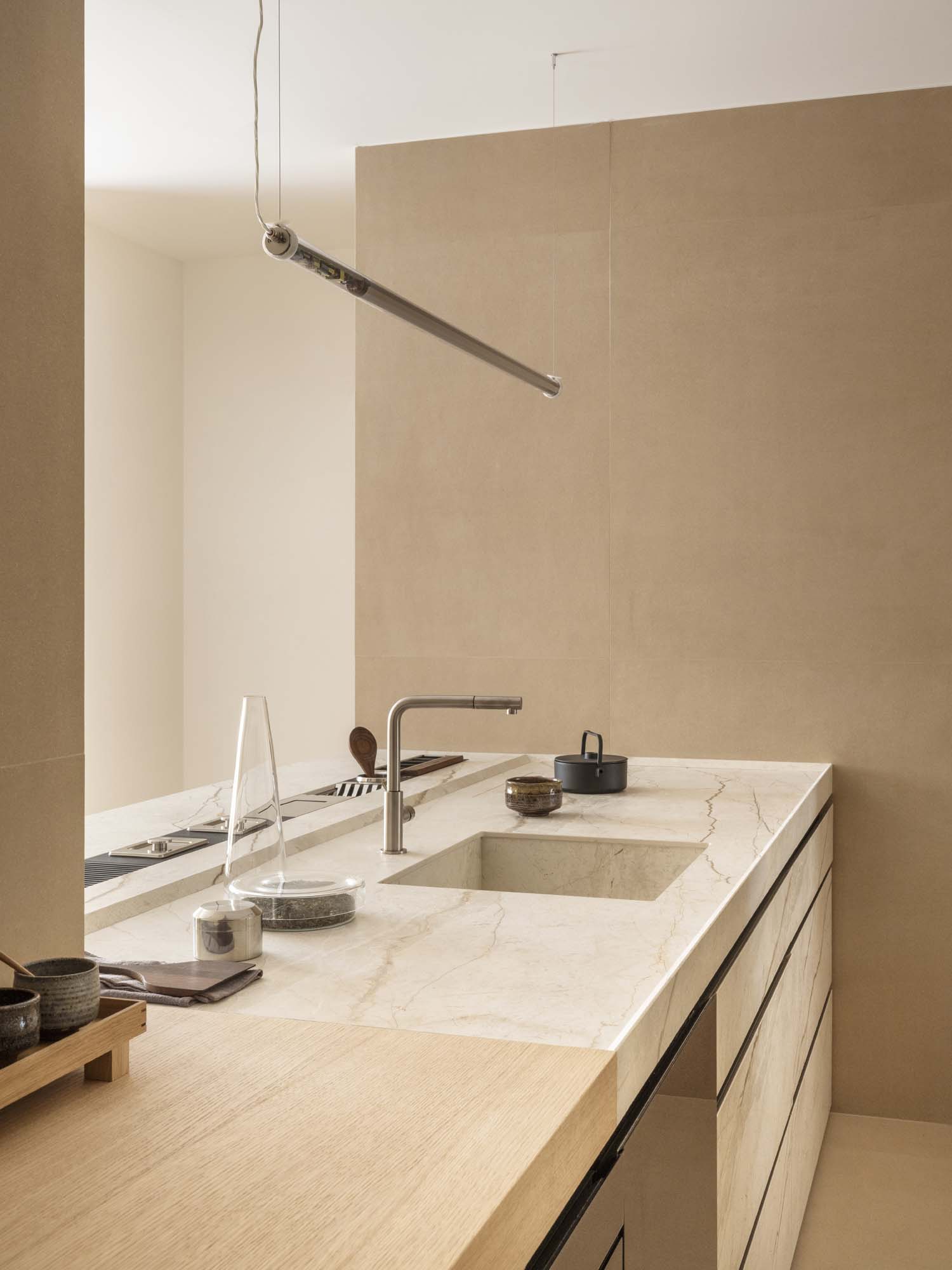 Obszar roboczy został radykalnie zmodyfikowany, wprowadzając otwartą kuchnię, która hybrydyzuje funkcje i języki. Kuchnia jest monolityczna i wyłożona dużymi płytami The Top Stone Look Silver Root, w kolorze White, którego charakterystyczną cechą są wyraźne żyły, które ścigają się na tle intensywnych odcieni.