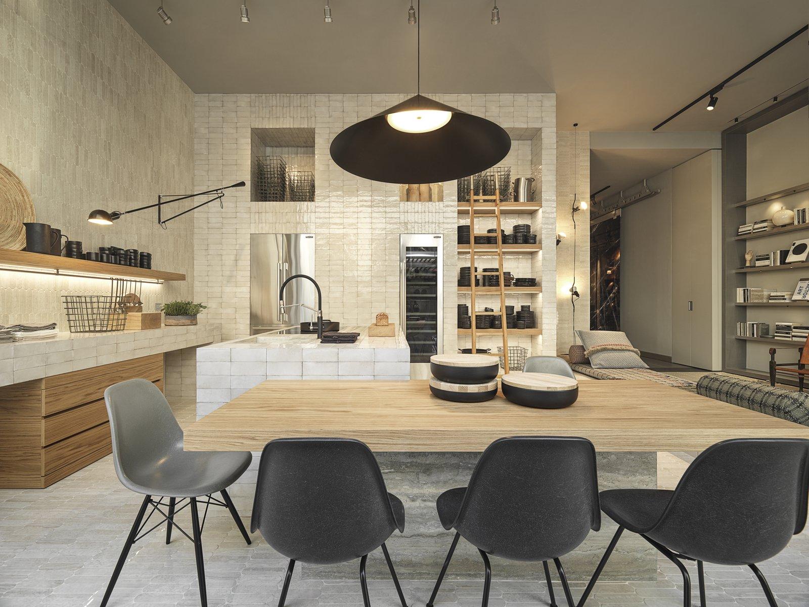 Kuchnia to od zawsze miejsce relacji, które w swojej historii typologicznej odzwierciedla ewolucję społeczną i technologiczną, a także różnorodność kultur w nieustannym i owocnym napięciu między tradycją oraz nowoczesnością. To środowisko eksperymentów i innowacji, odzwierciedla dziś hybrydowy i wszechstronny styl życia, doskonale wyrażany przez koncepcję „Living Kitchen”: dynamiczne połączenie kuchni z salonem, miejsce otwarte i stanowiące centralny punkt mieszkań. W oparciu o taką koncepcję pracownia Antonio Citterio Patricia Viel stworzyła instalację na rzecz mediolańskiego salonu Marazzi, pokazując wszechstronność kompozycyjną kolekcji Mystone Travertino w wersji Navona, w tym przypadku w formie owalnej błyszczącej mozaiki, i mocno połyskującej kolekcji Crogiolo Rice w odcieniu Natural (formaty 5 x 15, 7,5 x 20 i 15 x 15 cm). Z kolei Mystone Travertino Silver wybrano na kuchenny blat.