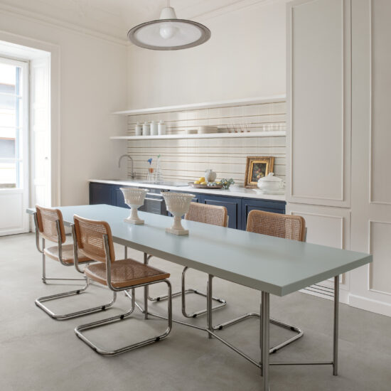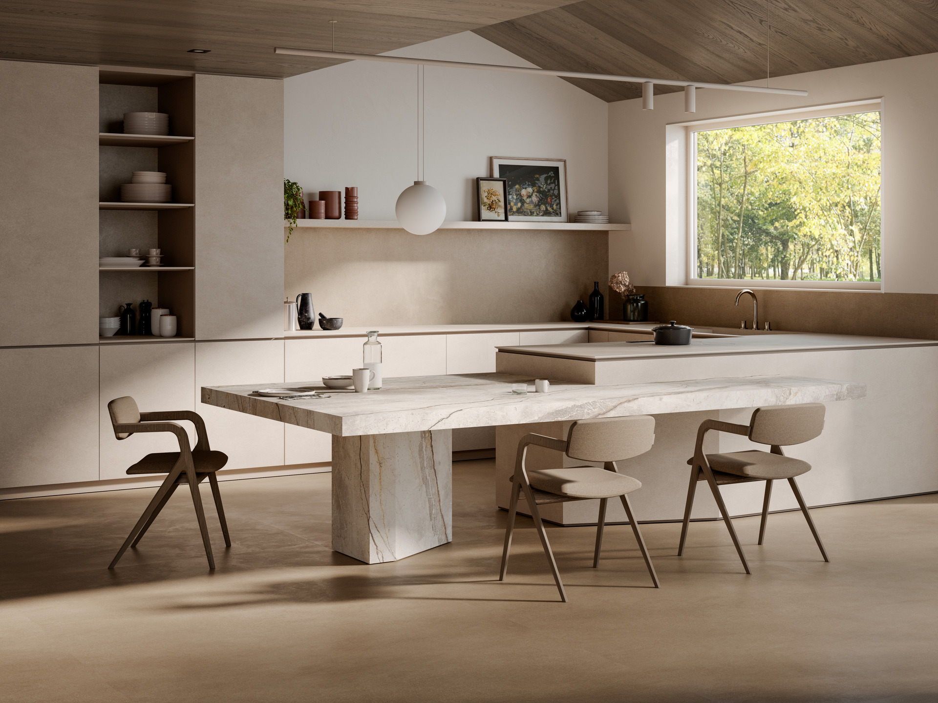 Ten materiał jest nie tylko piękny, ale i trwały: odporny na zużycie, wodoodporny, higieniczny i łatwy do utrzymania w czystości – cechy te czynią go idealnym do często użytkowanych przestrzeni, takich jak miejsca, gdzie się gotuje, je i spędza czas. Jego wysoka zwartość sprawia, że doskonale nadaje się zarówno na ściany, jak i podłogi w spójnej aranżacji, tworząc powierzchnie podkreślające przestrzeń i poprawiające wizualną percepcję open space.