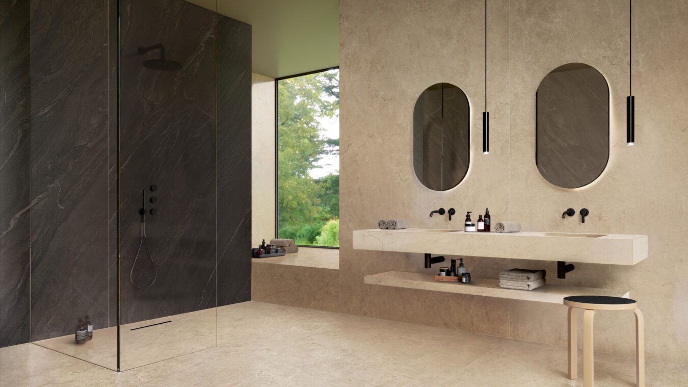 W domowych łazienkach do obiektów takich nawiązuje się poprzez bryły i powierzchnie, które są w dużej mierze pokryte okładzinami, a na których można podziwiać kontrasty barwowe i cieniowane żyłkowanie typowe dla szlachetnych kamieni czy marmurów. Bogata oferta efektów marmuru i kamienia w kolekcjach The Top Marble Look i Stone Look pozwala na projektowanie nietuzinkowych pomieszczeń w luksusowym stylu. Różnice między kolorami i teksturami tych kolekcji pozwalają na zestawienia ton w ton lub kontrasty strukturalne, jak te pomiędzy bardziej zwartymi i jednolitymi ziarnami porfiru lub wapienia i dużymi geometriami granitów oraz półprzezroczystych kwarcytów gamy Marble Look Patagonia. Duże płyty pozwalają również na tworzenie efektów poprzez różne sposoby ich ułożenia, podkreślając wrażenie ruchu generowane przez żyłkowanie. W przypadku niektórych kolekcji możliwe jest nawet układanie w stylu bookmatch i tworzenie efektu odbicia na ścianie.