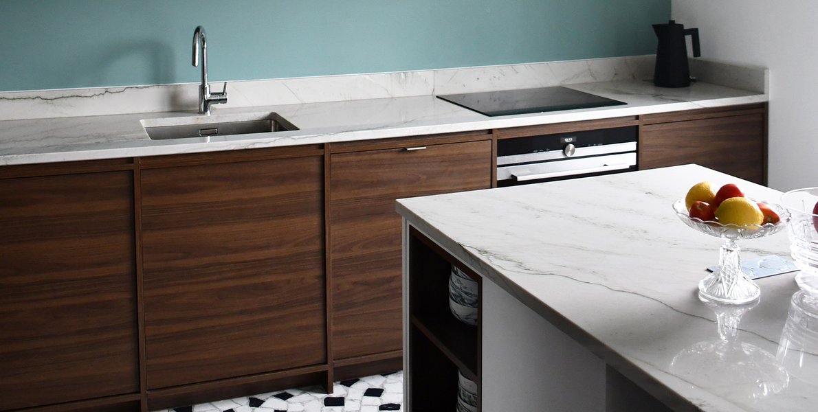 Najważniejszą częścią tego mieszkania jest salon, który wyróżnia się swoim niesamowitym charakterem. „Aby zapewnić niezbędną przestrzeń i wpuścić do niej więcej światła, całkowicie ją otwarłyśmy, tworząc pokaźny pokój dzienny z widoczną kuchnią, której meble stolarz wykonał na specjalne zamówienie”, opowiada Johane. „Na podłogę wybrałyśmy kolekcję Grande Marble Look Ghiara Palladiana (format 120 x 120 cm o grubości 6 mm z wykończeniem matowym), zarówno ze względu na jej motyw graficzny, jak i efekt retro; a blat kuchenny wykonał kamieniarz z regionu Annecy”, dodaje architektka.