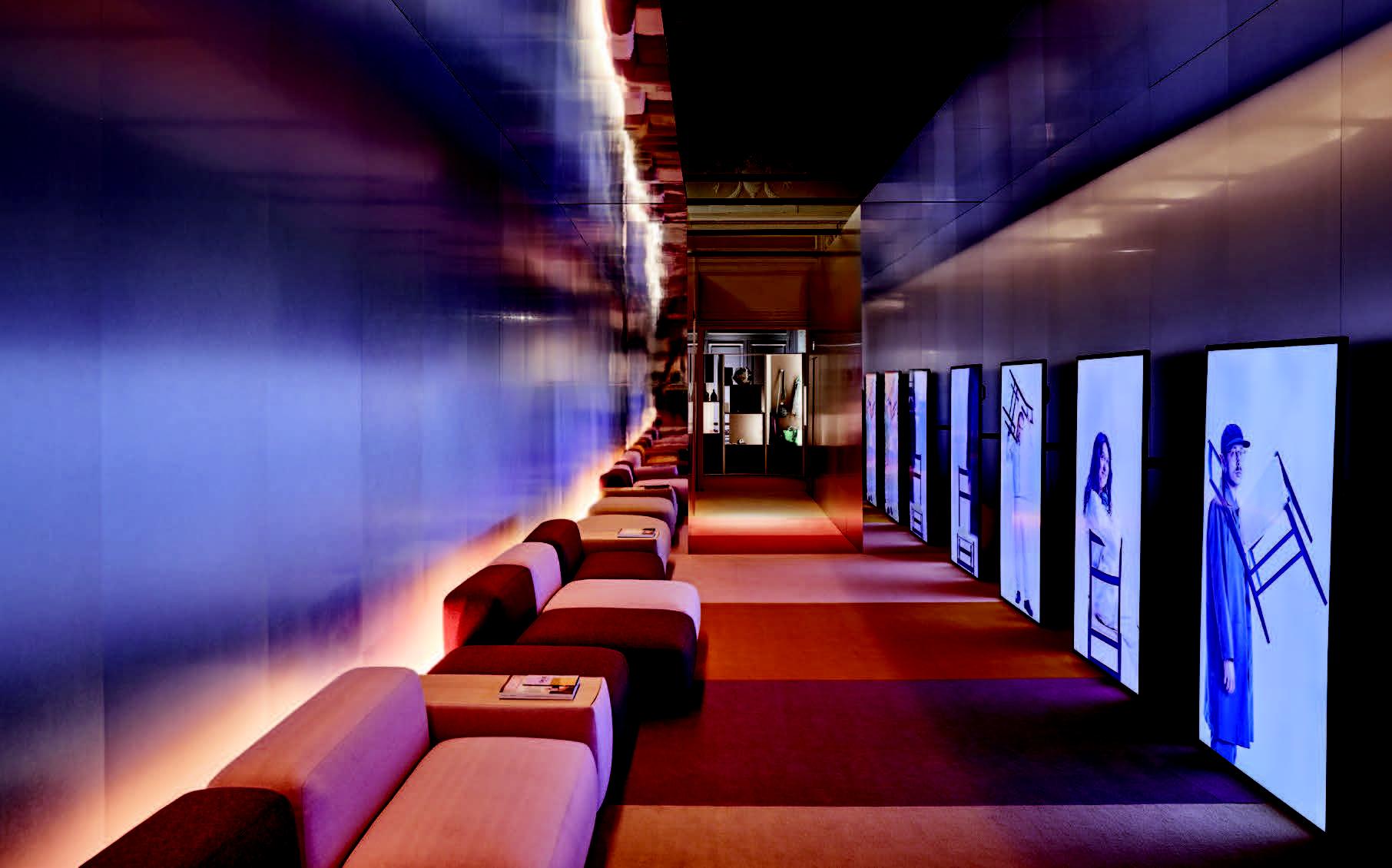 Instalacja ta zajmuje całą ścieżkę wzdłuż krużganku otaczającego wielki ogród w stylu włoskim. Jest to przestrzeń działająca niczym filtr pomiędzy pomieszczeniami klasztoru i strefą ogrodową. Dlatego chcieliśmy wyeliminować wyraźne rozróżnienie między poszczególnymi przestrzeniami. Wprowadziliśmy do krużganku zieleń, jakby była ona przedłużeniem ogrodu, zapewniając w ten sposób płynność między wnętrzem i zewnętrzem oraz podkreślając fakt, że umeblowanie strefy zewnętrznej jest coraz ważniejsze w codziennym życiu, podobnie jak pragnienie spędzania w niej czasu z maksymalną wygodą. Zwieńczeniem całej instalacji jest sekwencja kolorowych tkanin w odcieniach zieleni i koloru żółtego, które ograniczają powiewy wiatru i swymi delikatnymi ruchami towarzyszą zwiedzającym.