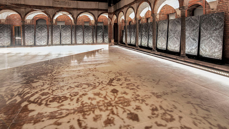Z okazji wystawy Metamorfuoco. Sotto la luce di Tintoretto, angielski artysta tworzy dużą podłogę w dialogu z arcydziełem Tintoretta: moduły z gresu porcelanowego Mystone Limestone Marazzi, które artysta użył jako białe płótno, na którym narysował naturalne elementy. Około 60 dekoracji, każda inna od pozostałych, zostało wydrukowanych dzięki najnowocześniejszej technologii cyfrowej.