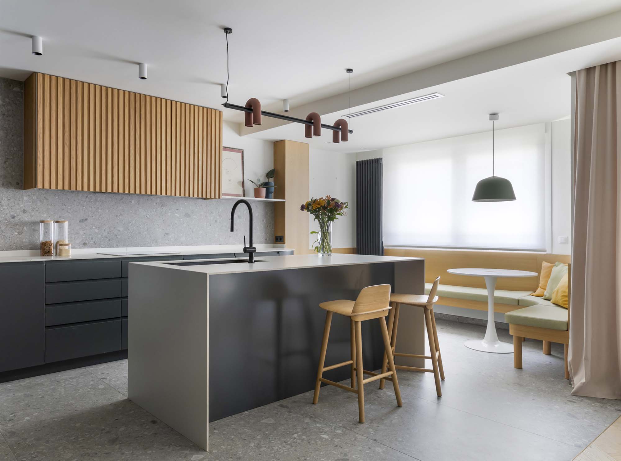 W sercu Madrytu dzielnica Guindalera skrywa historie splecione z urokiem miasta. To właśnie tutaj Studio Madera postanowiło tchnąć nową duszę w mieszkanie z lat 60., przekształcając je w przestrzeń płynną, społeczną i o współczesnym charakterze. Główną ideą było poszukiwanie doskonałej równowagi między funkcjonalnością a pięknem, podkreślając powściągliwą paletę materiałów, które przywołują solidność i elegancję.