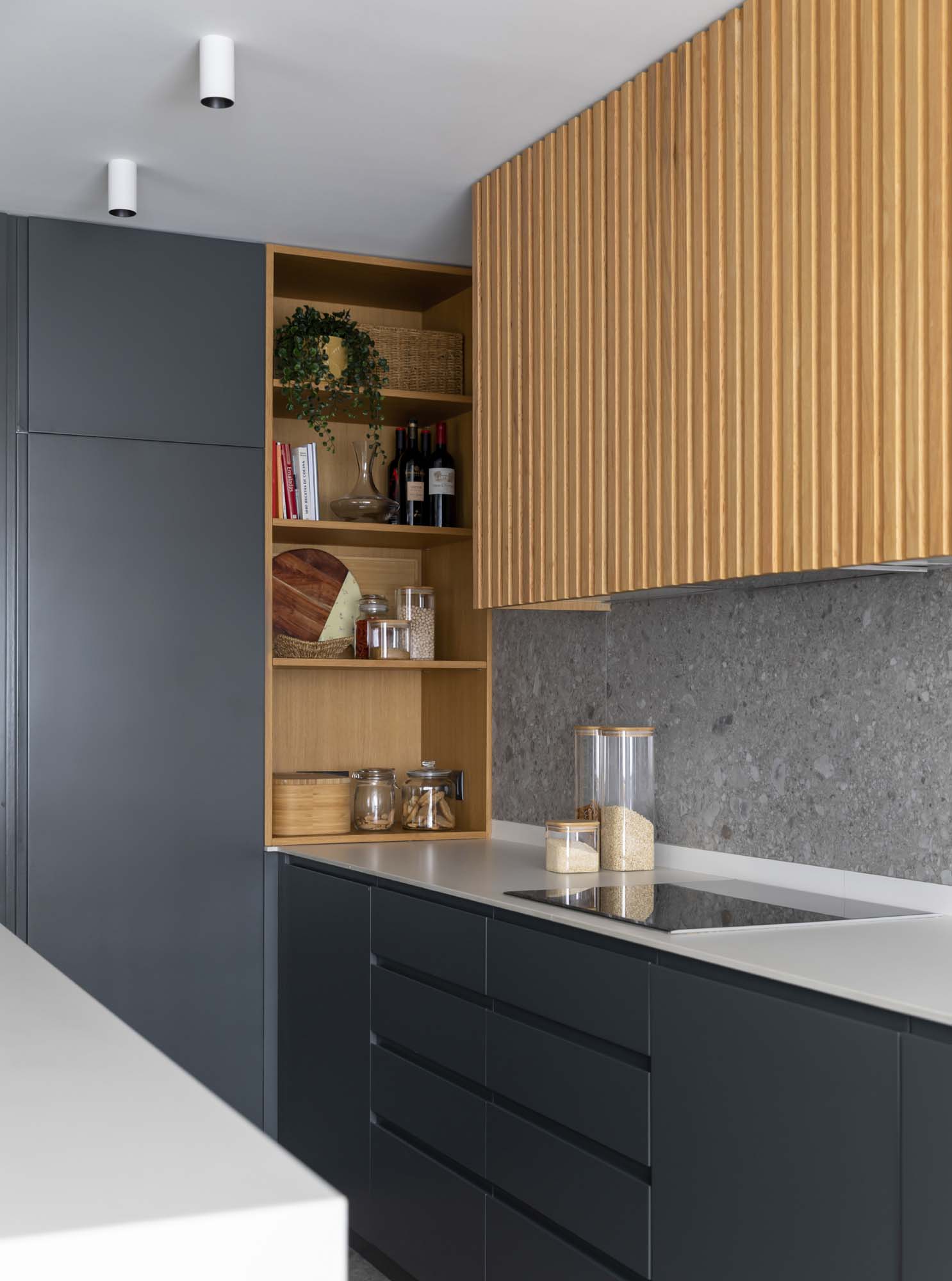 Kuchnia, będąca centralnym punktem życia społecznego mieszkania, wyróżnia się harmonijną integracją produktów Marazzi. Podłoga wyłożona jest płytkami gresowymi Mystone Ceppo di Gré Grey, które przywołują bogactwo materii charakterystyczne dla naturalnego, szaro-niebieskiego kamienia. Ten materiał nie tylko wyraża trwałość, ale jest także synonimem elegancji i wyrafinowania.