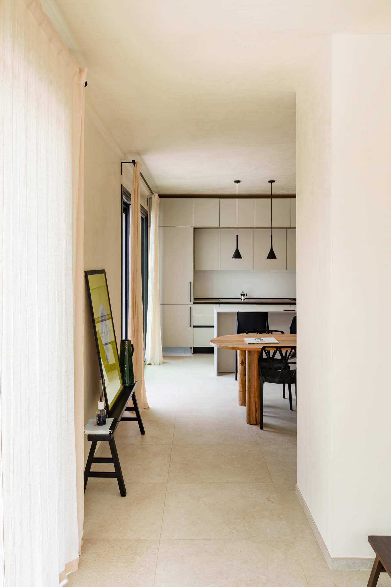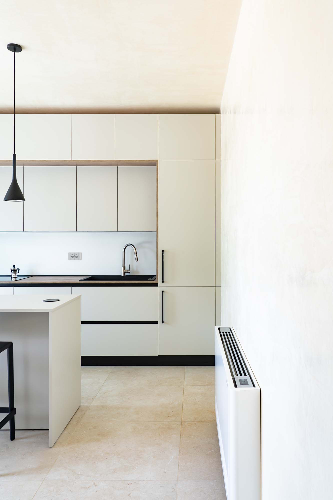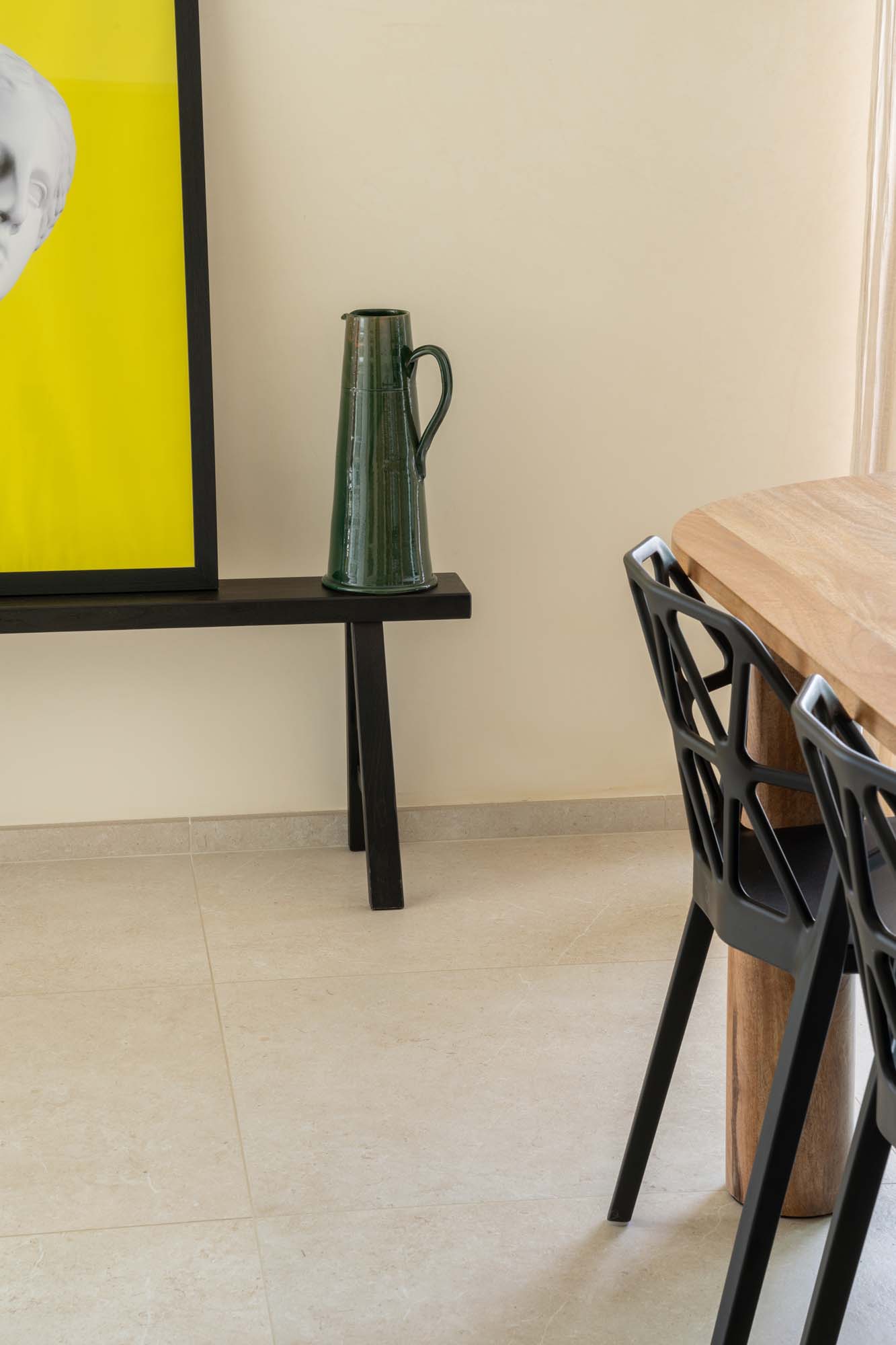 Kluczowe znaczenie dla powodzenia tego projektu miał dobór materiałów. Mara Prezioso postawiła na ceramikę marki Marazzi, a konkretnie na gres porcelanowy o efekcie kamienia Mystone Limestone w jasnym kolorze Ivory, który położono na podłogach całego domu. Wybrano ten właśnie produkt, bowiem potrafi on podkreślać kontrast między rustykalnym charakterem „trulli” a nowoczesnym wnętrzem. Kolekcja Mystone Limestone, dzięki swym ciepłym i naturalnym odcieniom, doskonale komponuje się ze ścianami z kamienia i z elementami z drewna, tworząc przytulne wnętrza o wyrafinowanym charakterze.