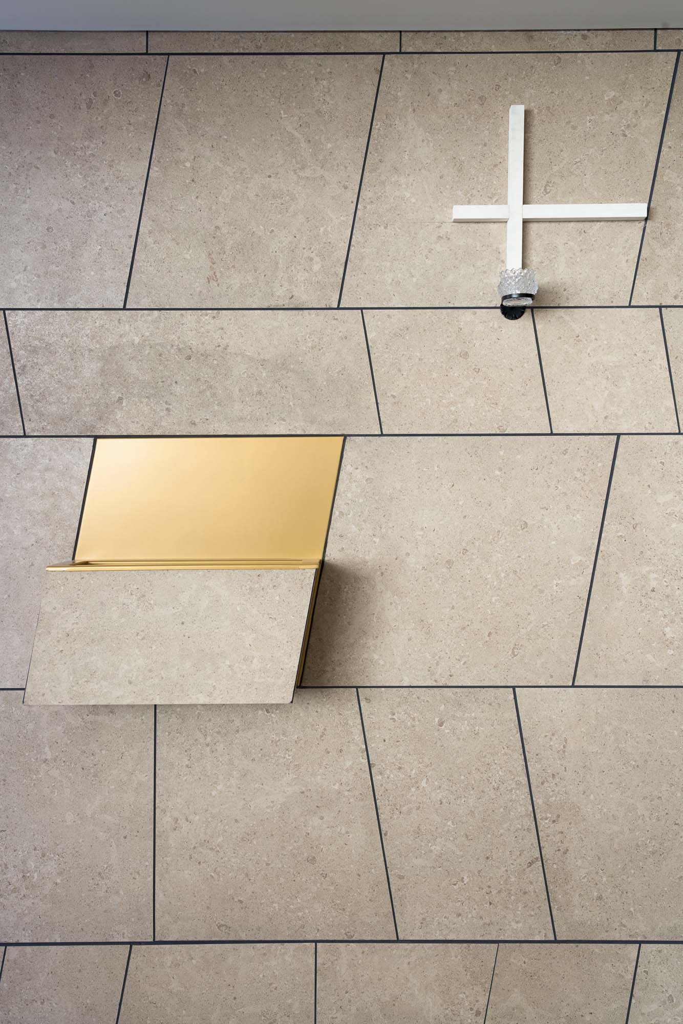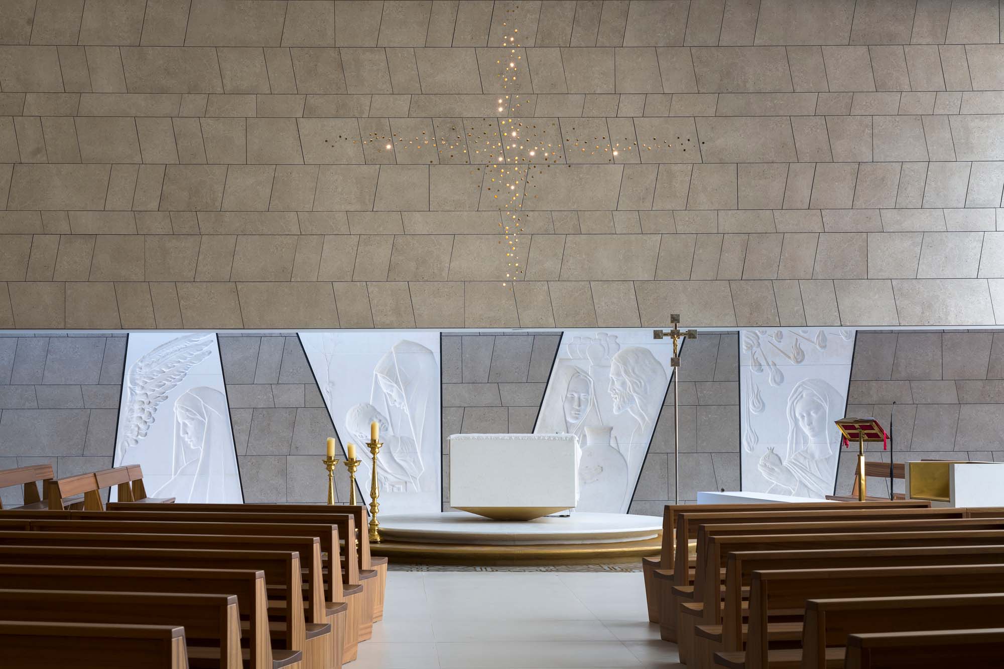 Wykonana ze zbrojonego betonu konstrukcja z zewnątrz została wyłożona gresem porcelanowym z kolekcji Mystone Gris Fleury, zainstalowanym z wykorzystaniem technologii elewacji wentylowanej, systemu zapewniającego znaczną oszczędność energii i poprawiającego parametry termo-higrometryczne, ale też rozwiązującego problemy związane z wilgocią i gwarantującego doskonałe warunki we wnętrzu, zarówno latem, jak i zimą. „Okładzina zewnętrzna wykonana z ceramiki Mystone Gris Fleury marki Marazzi — objaśnia architekt Manuel Giuliano — została wybrana po dokonaniu wnikliwej oceny wielu innych rozwiązań, właśnie ze względu na jej bliskość estetyczną z kamieniem widocznym na znajdującej się za budynkiem górze. Światło zachodzącego słońca sprawia, że bryły kościoła wtapiają się w otoczenie”.