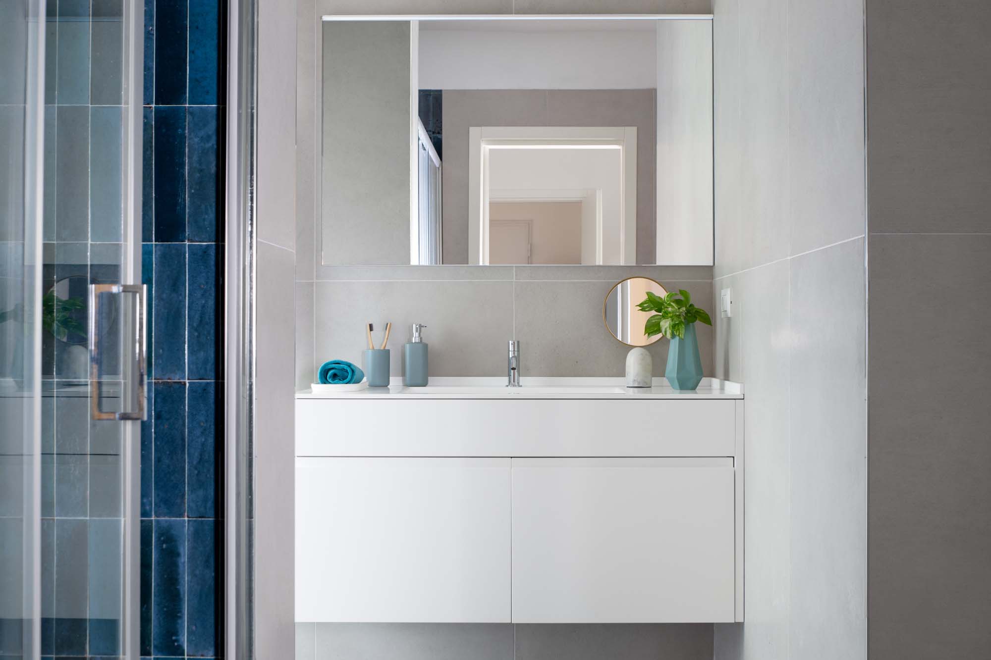 Łazienka główna, z prysznicem wnękowym i drzwiami przesuwnymi, została wykończona kolekcją Crogiolo Lume w formacie prostokątnym 6x24 cm, w kolorze niebieskim.