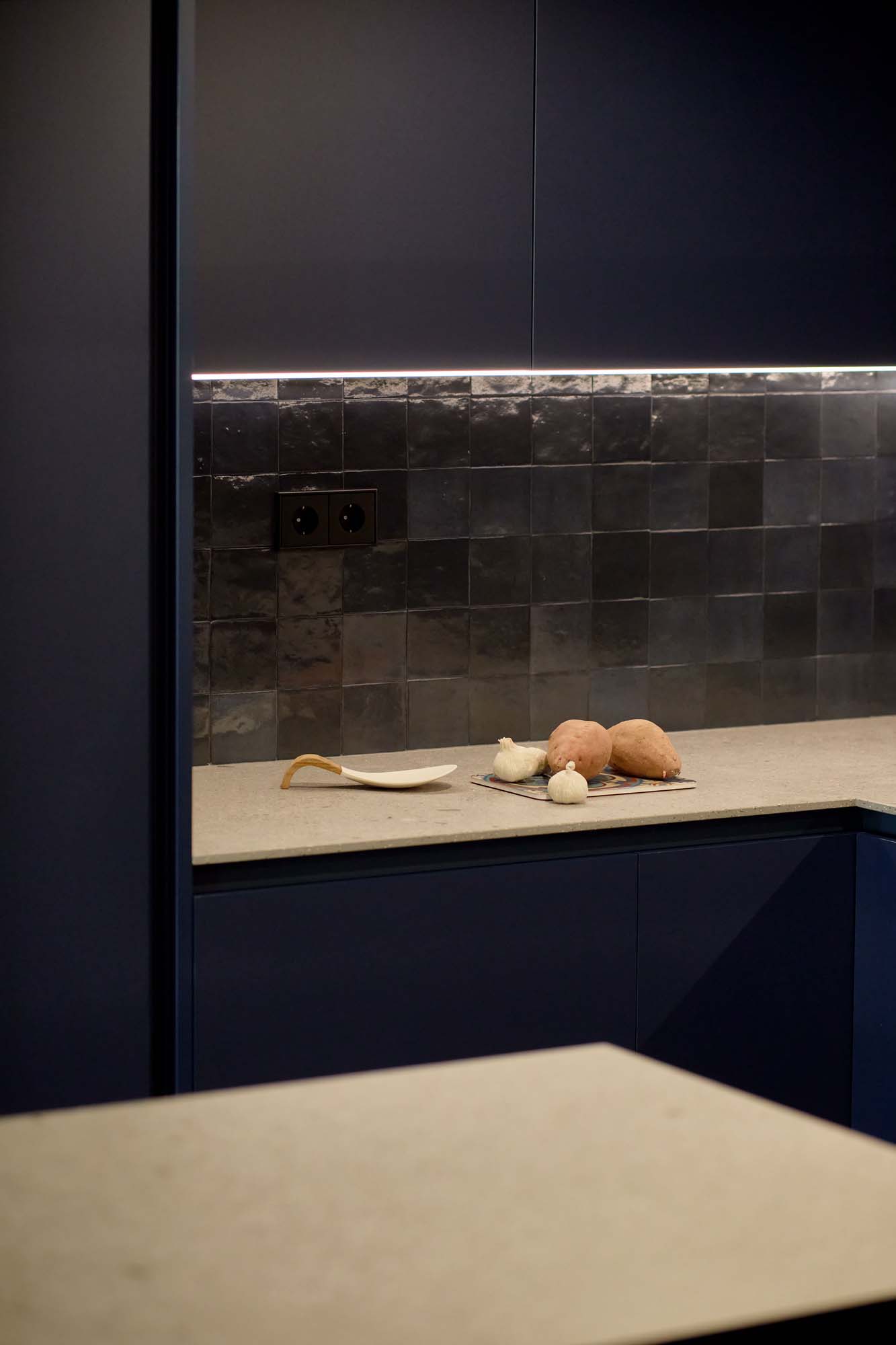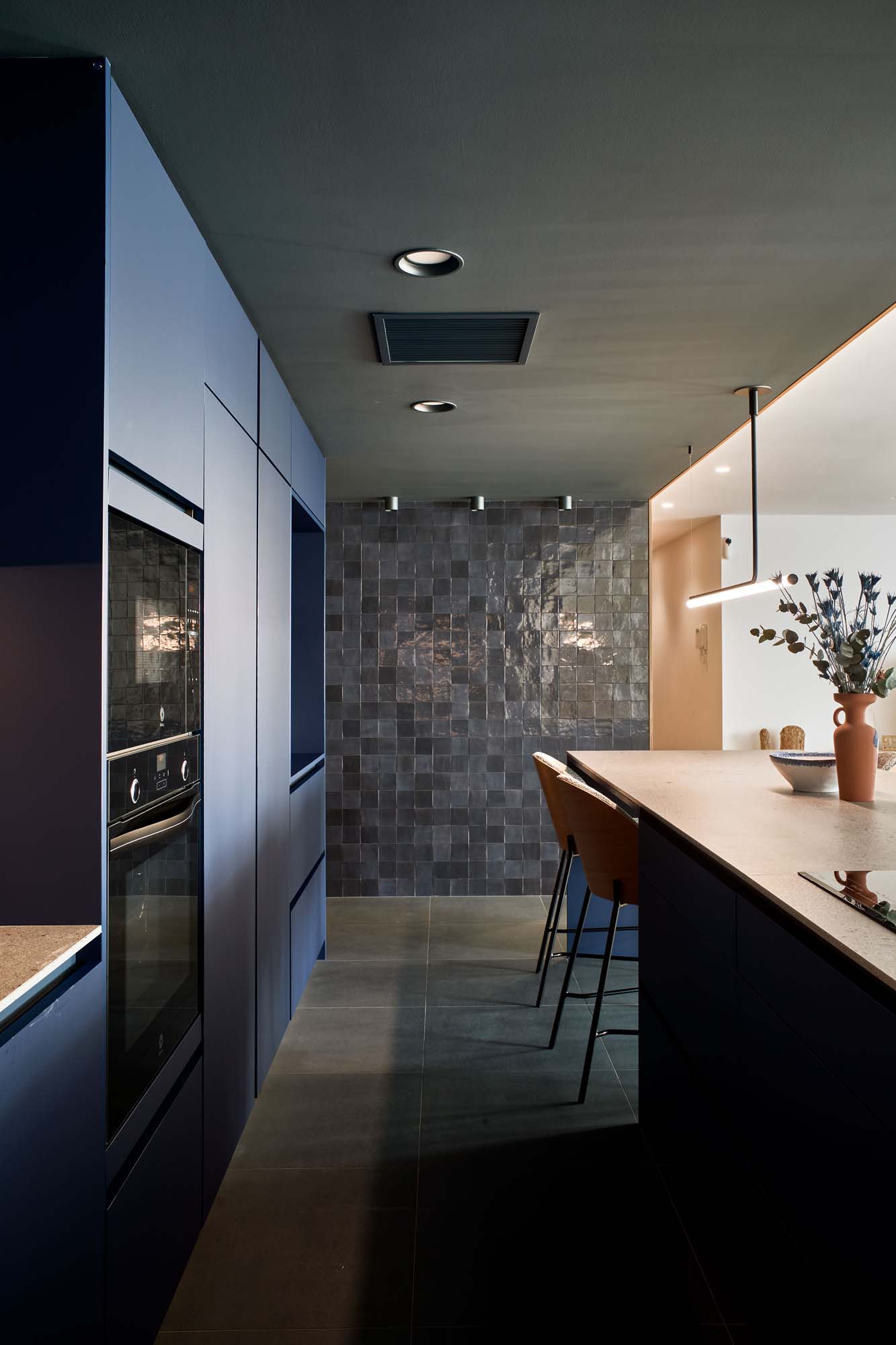 Podłoga całego domu została wykonana z serii Cementum w formacie 120x120 cm, naprzemiennie wykorzystując odcień Ash w bardziej neutralnych obszarach oraz Indigo w „veta”, w kuchni i łazienkach. To rozwiązanie pozwoliło zachować jednolity układ wzoru pomimo zmiany koloru, ustanawiając równowagę chromatyczną między solidnością szarych tonów a głębią niebieskiego, nawiązującą do otaczającego środowiska morskiego. Do pokryć pionowych zastosowano kolekcję Zellige z serii Crogiolo w kolorze China (10x10 cm), która dzięki szkliwionej powierzchni wprowadza świetlne wibracje i zmieniające się refleksy, wzbogacając monochromatyczną paletę o żywe i dynamiczne odcienie.