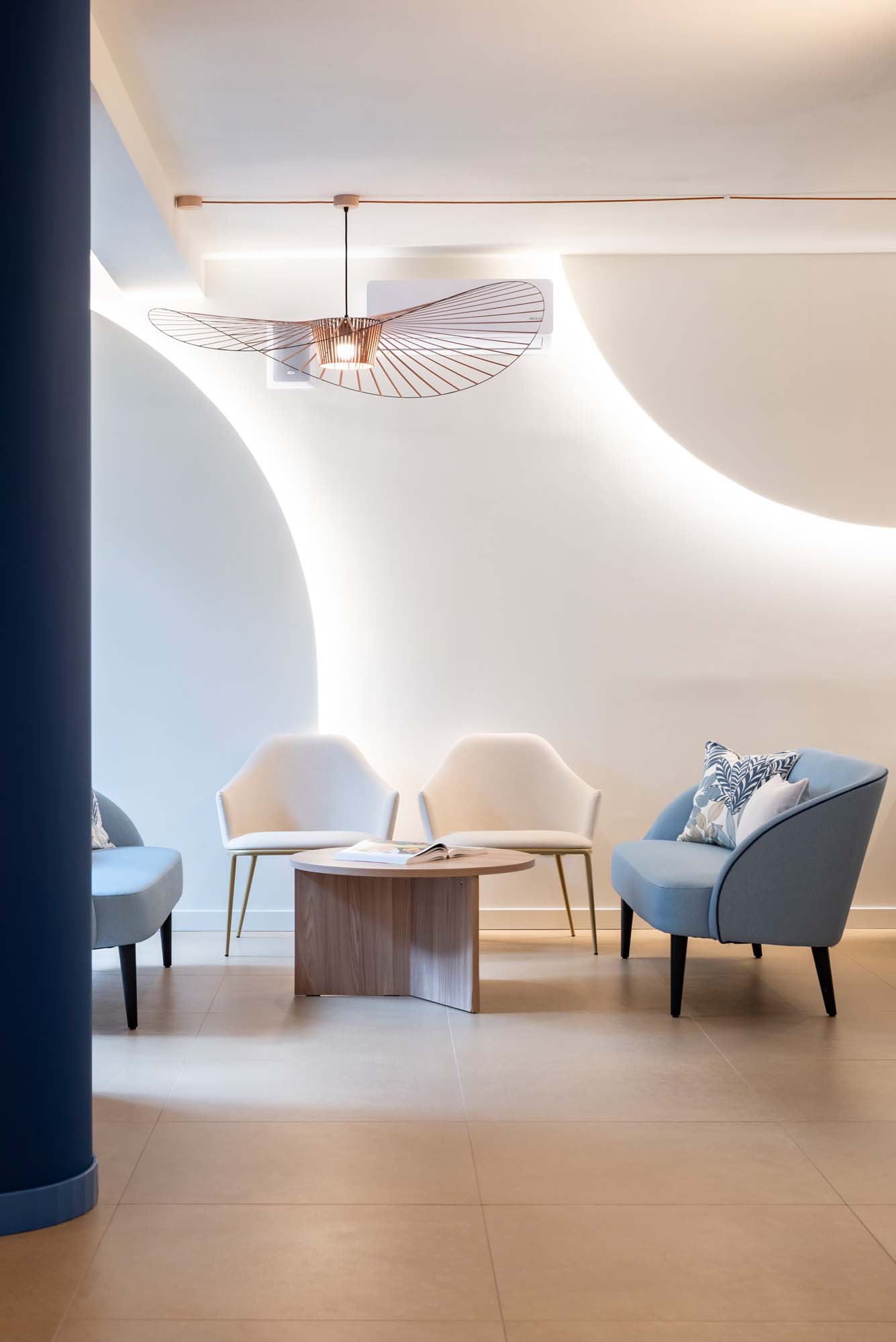 Wołanie morza, piasku i fal to motyw przewodni hotelu Tuscany Hotel Alle Dune w Castagneto Carducci (Livorno), zaprojektowanego przez Hub 48 Studio firmy Bonfante Interior Contractor. Celem było odtworzenie we wnętrzach wrażenia zanurzenia w toskańskim krajobrazie nadmorskim. „To nie są wnętrza tematyczne” – komentuje Sofia Bonvicini, projektantka wnętrz z Hub 48 – „lecz koncepcyjne przedstawienia elementów morskich, takich jak biało-niebieska podłoga w jodełkę w pokojach, która geometrycznie przywodzi na myśl fale morskie, odcienie drewna nawiązujące do koloru piasku i biel odbijająca światło.”