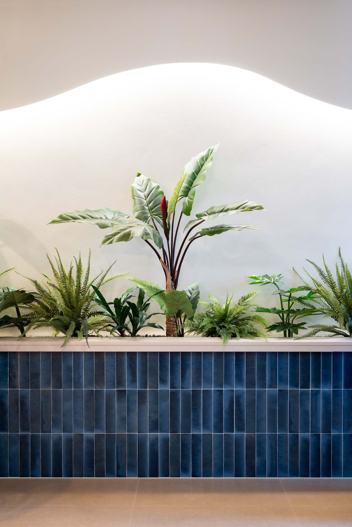 We wnętrzach hotelu szeroko zastosowano ceramikę. „Potrzebowaliśmy produktów świeżych i z wyrazistą fakturą, z błyszczącymi kontrastami, intensywnymi kolorami i tysiącem odcieni, które wyglądałyby jak ręcznie szkliwione i pozwalały na kreatywny montaż. Ceramika była kluczowym narzędziem do interpretacji koncepcji.” Hub 48 wybrało kolekcję gresu porcelanowego Slow inspirowaną tradycyjną terakotą w dekorze Rafia (format 120x120 cm), której żłobiona dekoracja wzbogaciła podłogi holu i baru oraz ściany łazienek i innych przestrzeni wspólnych o graficzne motywy i wyrafinowane kontrasty. Ta faktura jest możliwa dzięki technologii Premium 3D Ink firmy Marazzi, która zapewnia niezwykły realizm materiałowy dzięki idealnemu dopasowaniu grafiki i struktury powierzchni. Seria Crogiolo Scenario, inspirowana majoliką typową dla regionów śródziemnomorskich (format 20x20 cm), została użyta w układzie jodełki na podłogach pokoi oraz jako okładzina ścienna w łazienkach. Płytki małego formatu z super błyszczącym szkliwem z kolekcji Crogiolo Lume zostały użyte do podkreślenia ściany baru w specjalnym układzie koszykowym, a także pojawiają się jako okładzina mebla-doniczki przy wejściu, co świadczy o elastyczności zastosowania tego materiału.