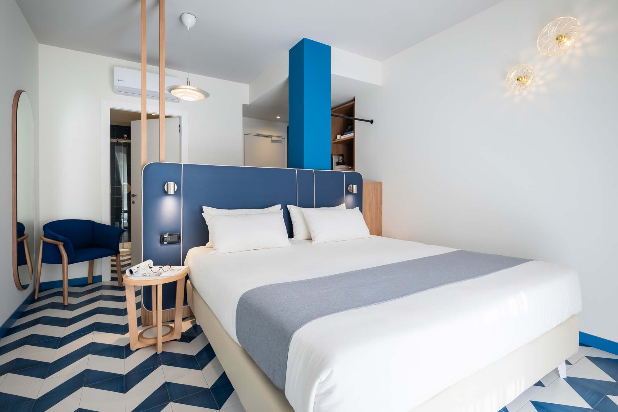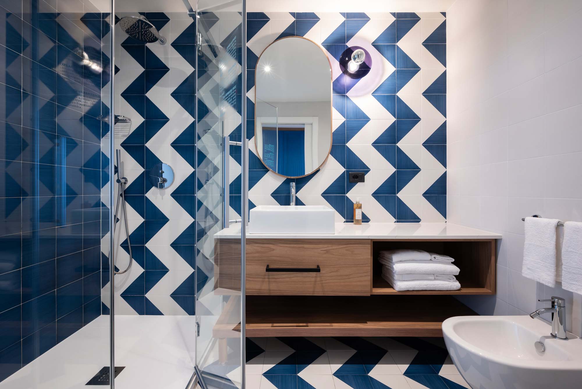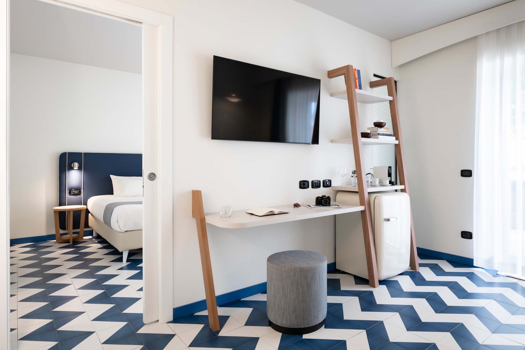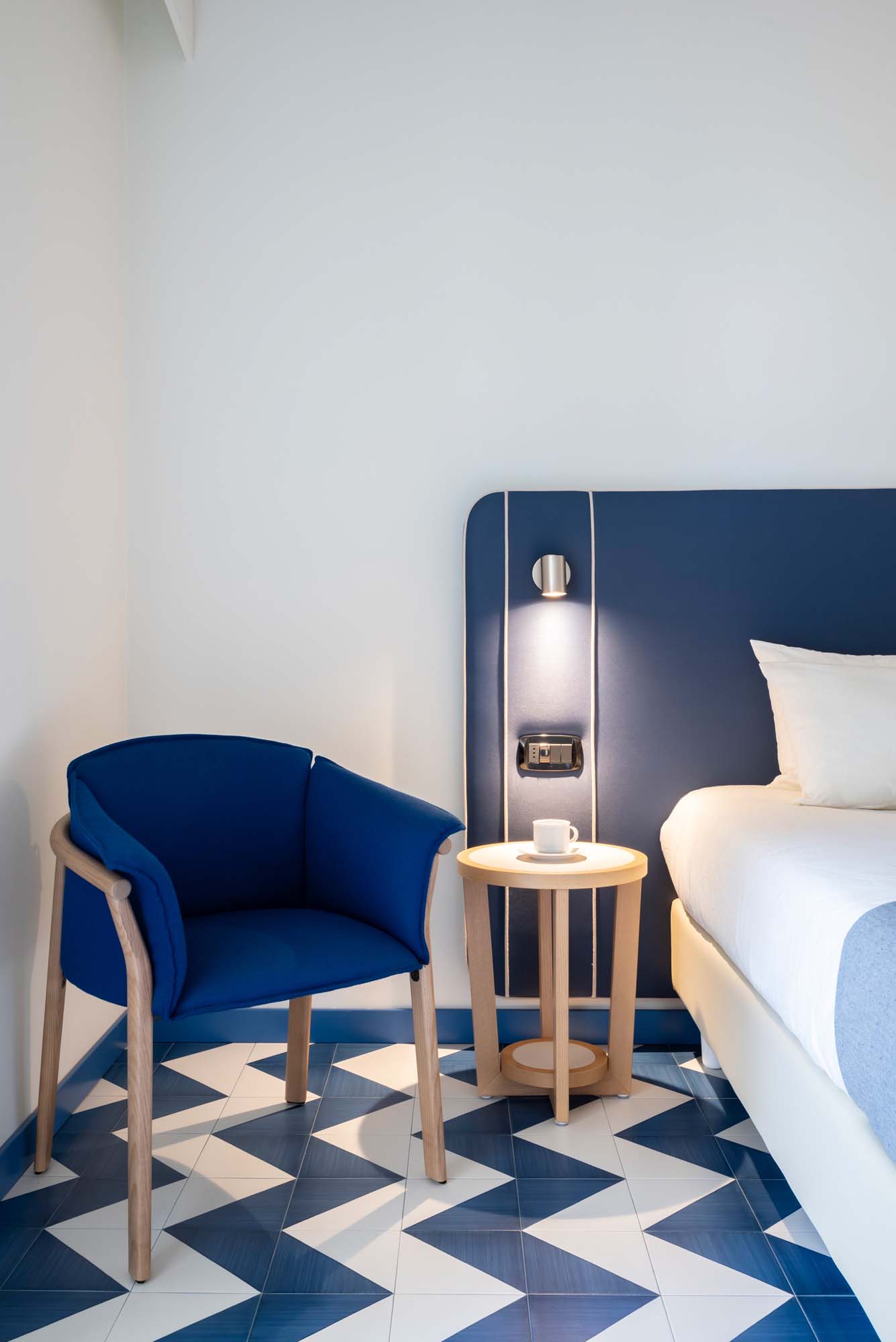 Pomieszczenia – od holu po pokoje – są niewielkie, ale funkcjonalne: „Zanim opracowaliśmy koncepcję” – kontynuuje Bonvicini – „rozpoczęliśmy od analizy istniejących przestrzeni, przekształcając układ, burząc i odbudowując ścianki działowe, aby zoptymalizować wnętrza. W holu przeanalizowaliśmy przepływy i funkcje, aby wyznaczyć strefy operacyjne (bar i recepcję), starając się podkreślić elementy konstrukcyjne – na przykład umieściliśmy ławki między filarami lub stoliki w korytarzu: elementy funkcjonalne, które stały się estetyczne. W pokojach staraliśmy się powiększyć łazienki, szczególnie prysznice i blaty umywalek.”