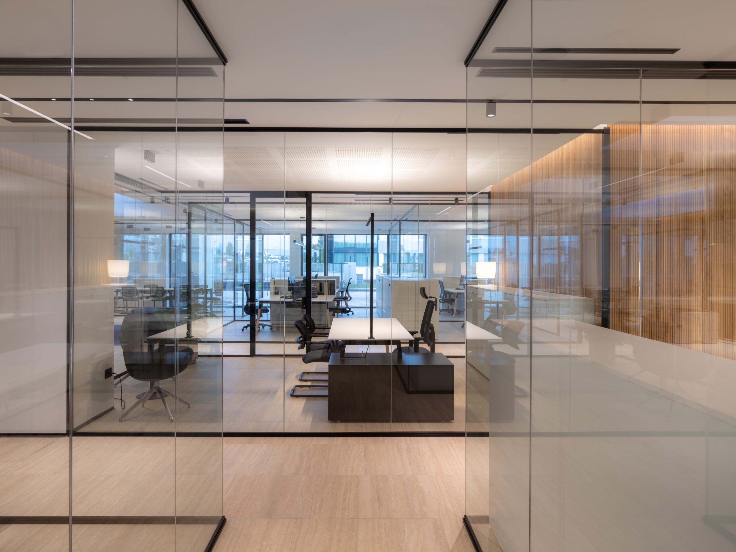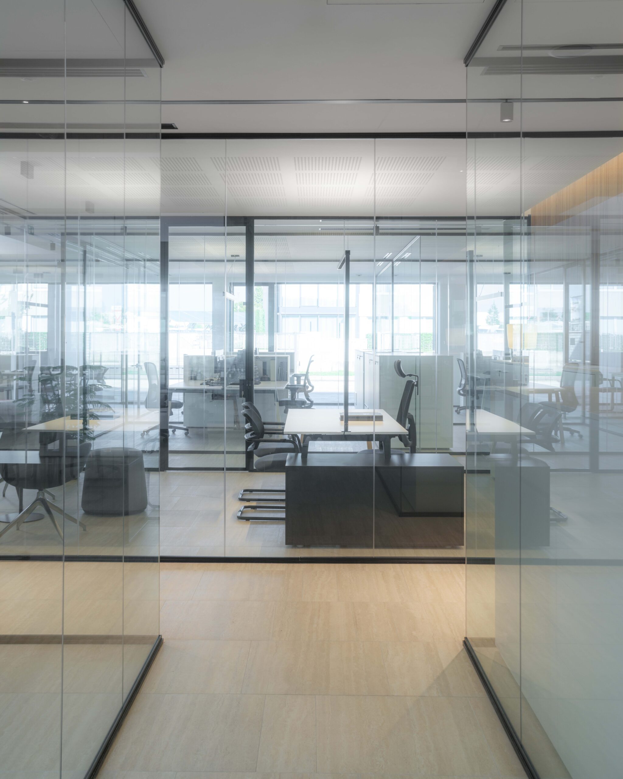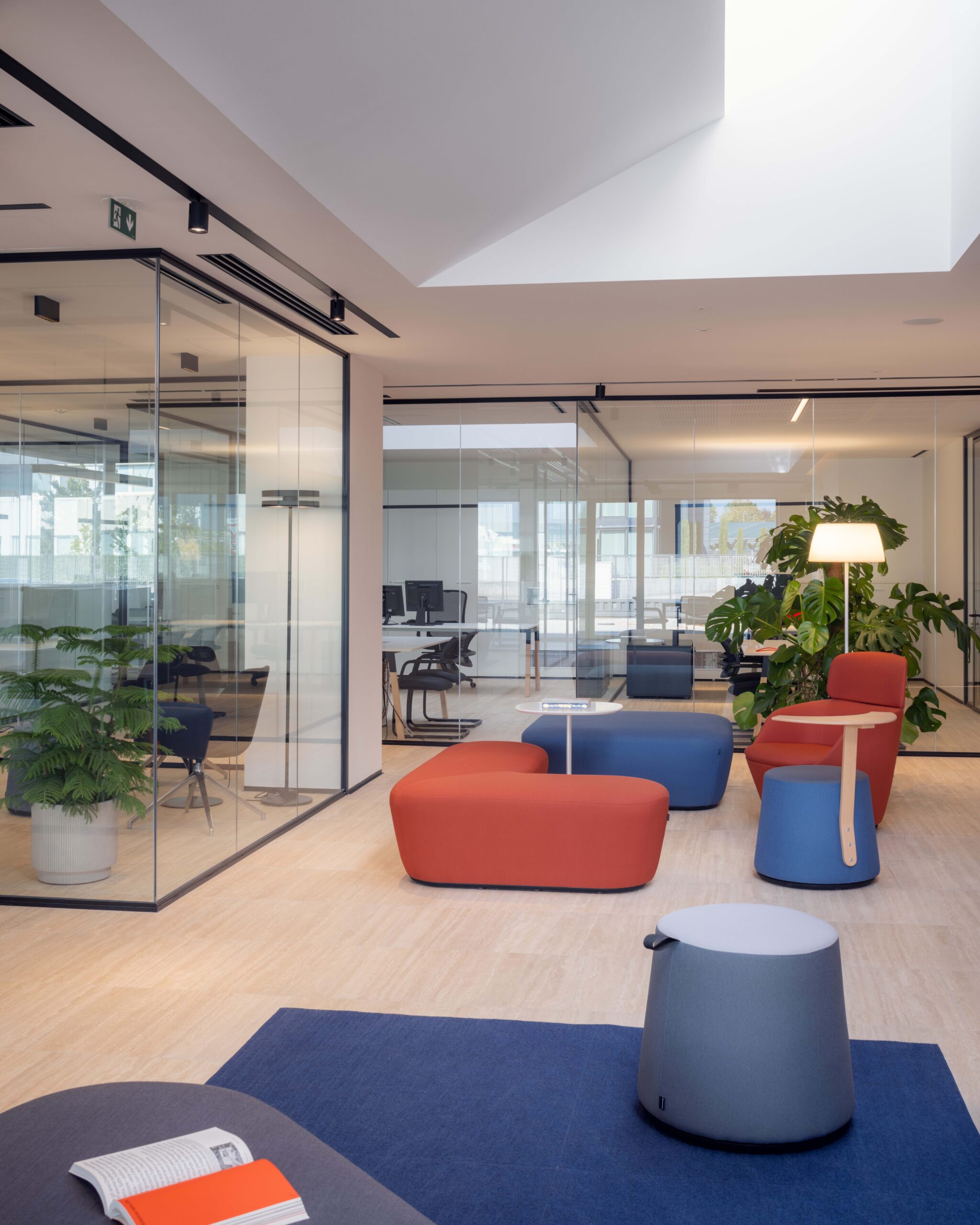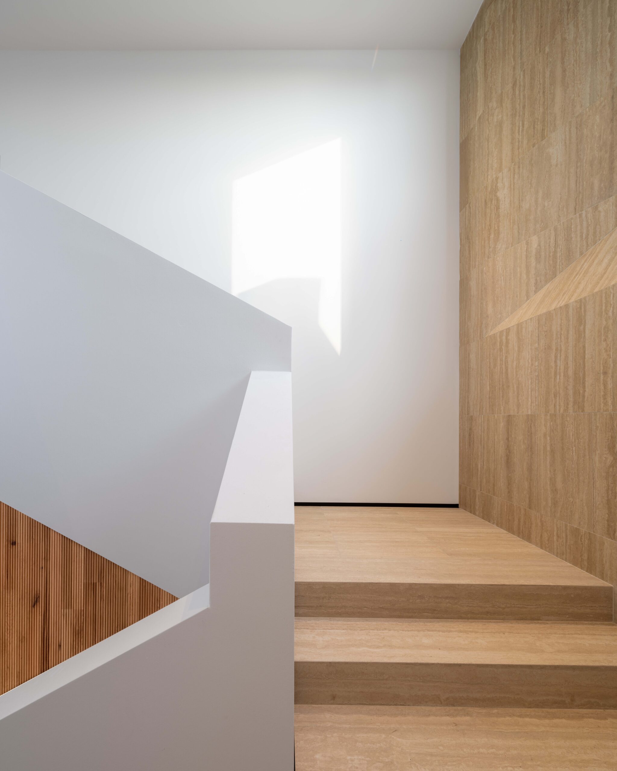 Dzięki dobraniu neutralnych materiałów budynek zyskał nowoczesną i ponadczasową estetykę, a jego pomieszczenia i otoczenie są miłe dla oka oraz odpowiednio wyważone. Na wszystkie podłogi biur projektanci wybrali kolekcję z gresu porcelanowego o efekcie kamienia Mystone Travertino Classico 60 x 60 cm oraz tę samą kolekcję jako okładzinę niektórych ścian, dobierając różne rozmiary płyt i różne sposoby ułożenia, z charakterystycznym przesunięciem.