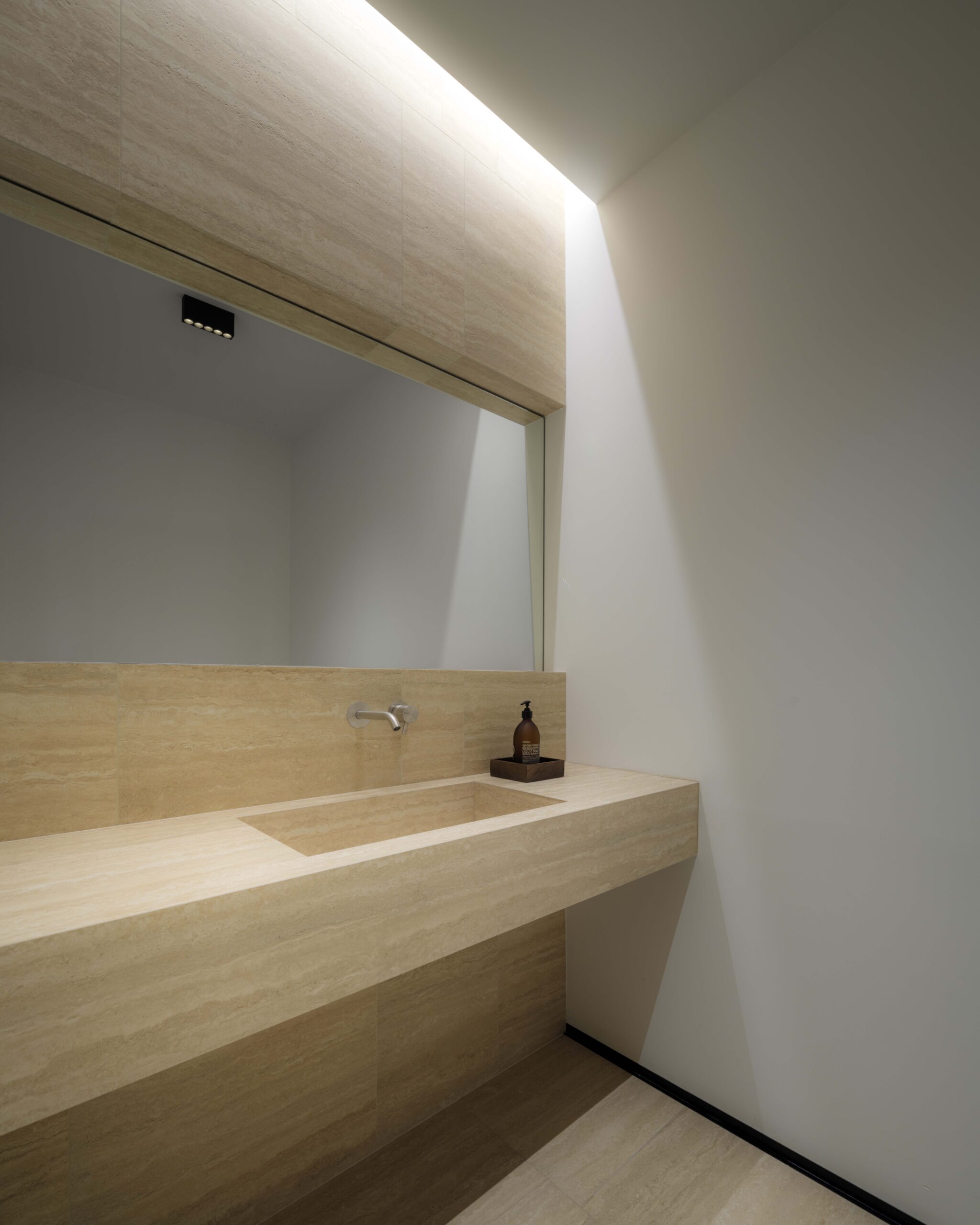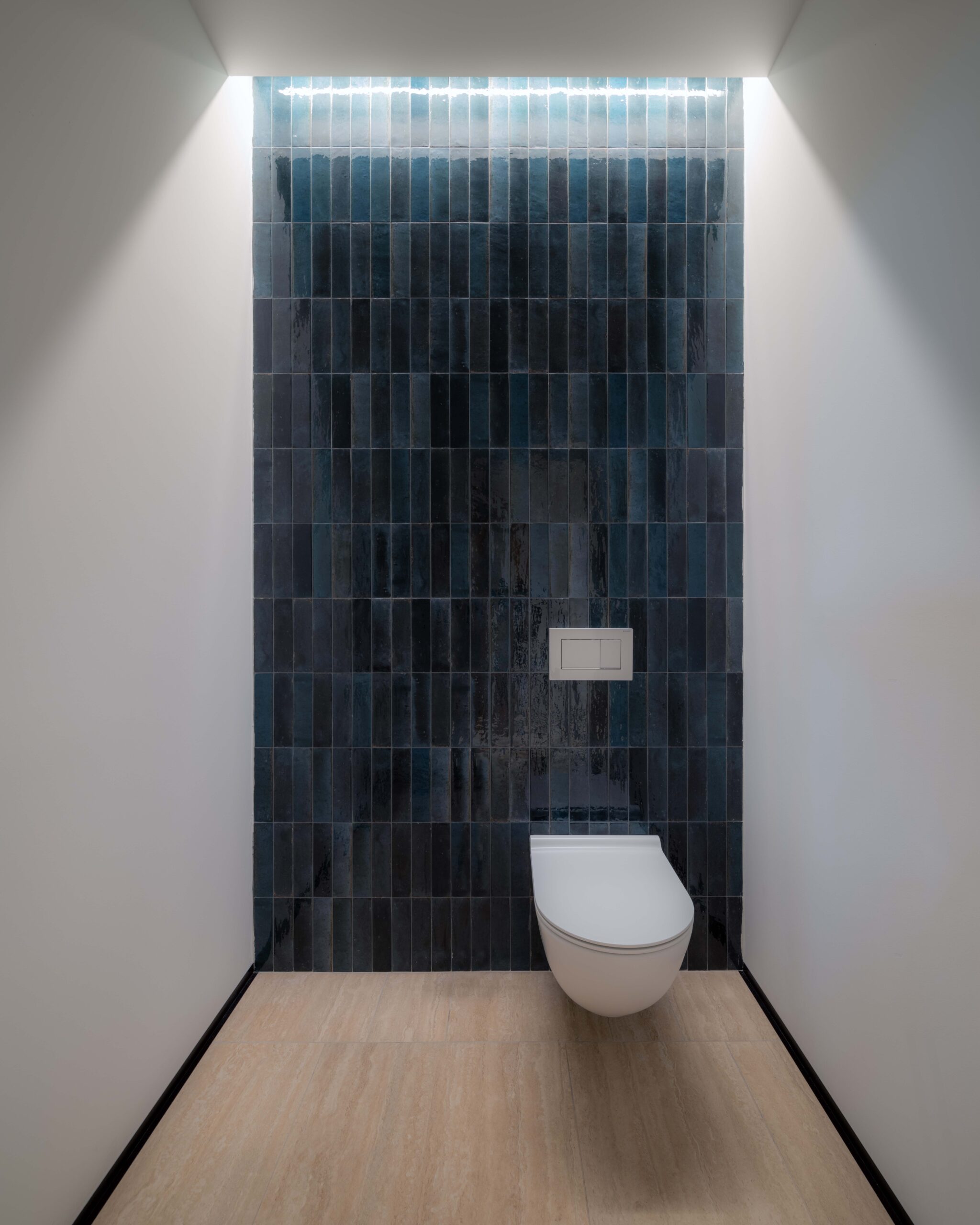W przypadku łazienek postawiono na mocno błyszczące cegiełki Crogiolo Lume Blue na ścianach, tworzące niesamowitą grę świateł, natomiast zarówno na podłogach, jak i jako blaty wykorzystano w głównej mierze kolekcje Mystone Travertino i The Top Stone Look Travertino, dzięki którym pomieszczeniom zdołano nadać pożądane wrażenie ciągłości.